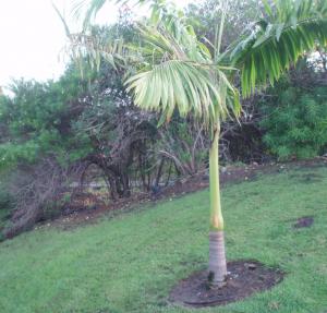 Realmente, tiene algo de protección, bajo una Tebetia, creo, pero recibe sol directo durante unas cuantes horas al día. No es muy rápida, en un año solo ha sacado una o dos hojas, pero ha aprovechado para engrosar la base del estípìte. Cuando llegó se tambaleaba, llegué a pensar en su devolución, pero la plantamos y tutorizamos. Ahora ya está solidamente arraigada.
