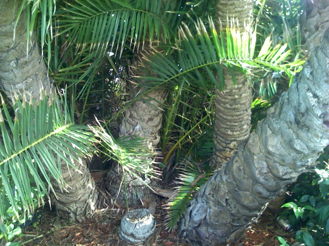 Peering into the fronds, the tallest trunk is about 4 feet tall. This coming spring I'm going to thin (remove the bottomost fronds) this clump out so as to expose the trunks. Same with my first clump: