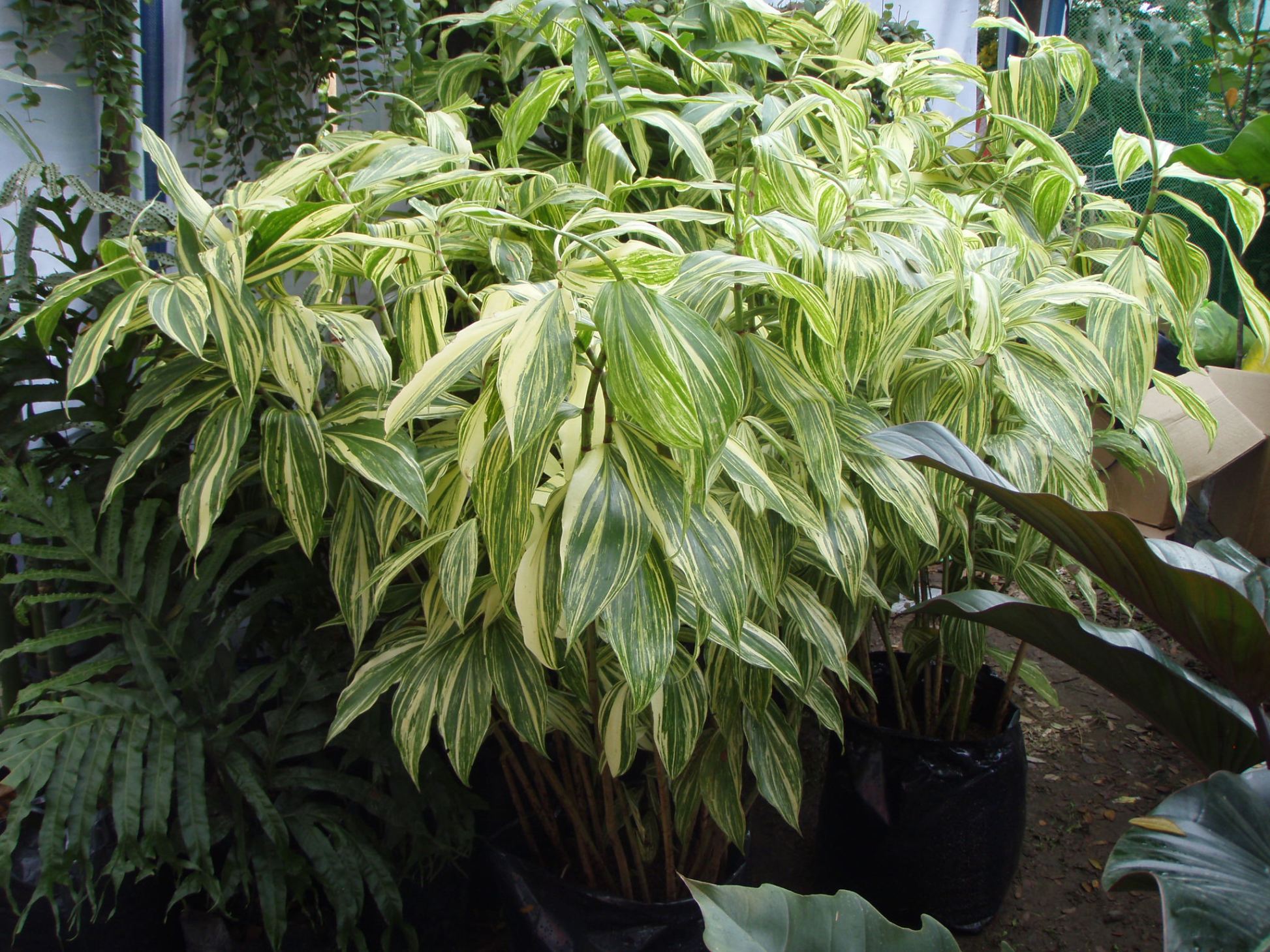 A large Variegated Pandanus and a variegated ginger.