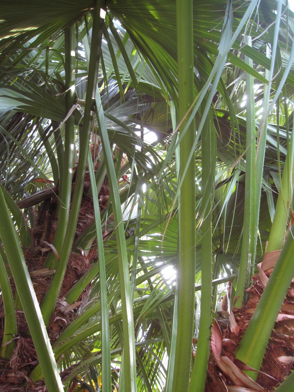 I never trimmed a green leaf from these until I needed to work in the bed in April 2006. Today, my triple palms (Picture 2) are much bigger and healthier than the others (Picture 3). My palms are approximately 30 feet (9 meters) tall overall, where as the others are only 8 to 10 feet (3 meters) tall.