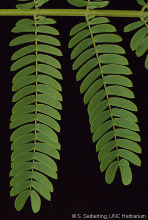 The Mimosa leaflets are not symetrical and have a slight horn shape with a point at the end. See below.