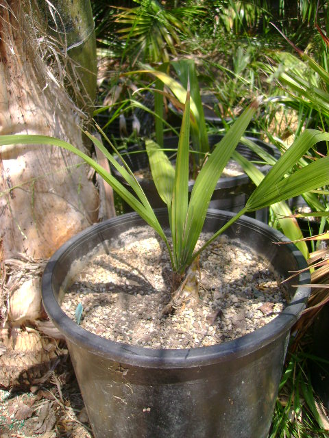 I believe I transplanted them last September or October. I just went out there a minute ago to take pictures and they appear healthy above ground. Looking down below at the base of the pot the sow bugs have mined out some of the dirt at the drainage holes, but nothing alarming- pretty typical for plants sitting in the dirt. I can see roots at the drainage holes- newer roots- that are new from when I transplanted it, but nothing new topside. I have a Sabal yapa that I transplanted as well at the same time and it seems to be growing well- but of course this is like comparing apples to oranges!