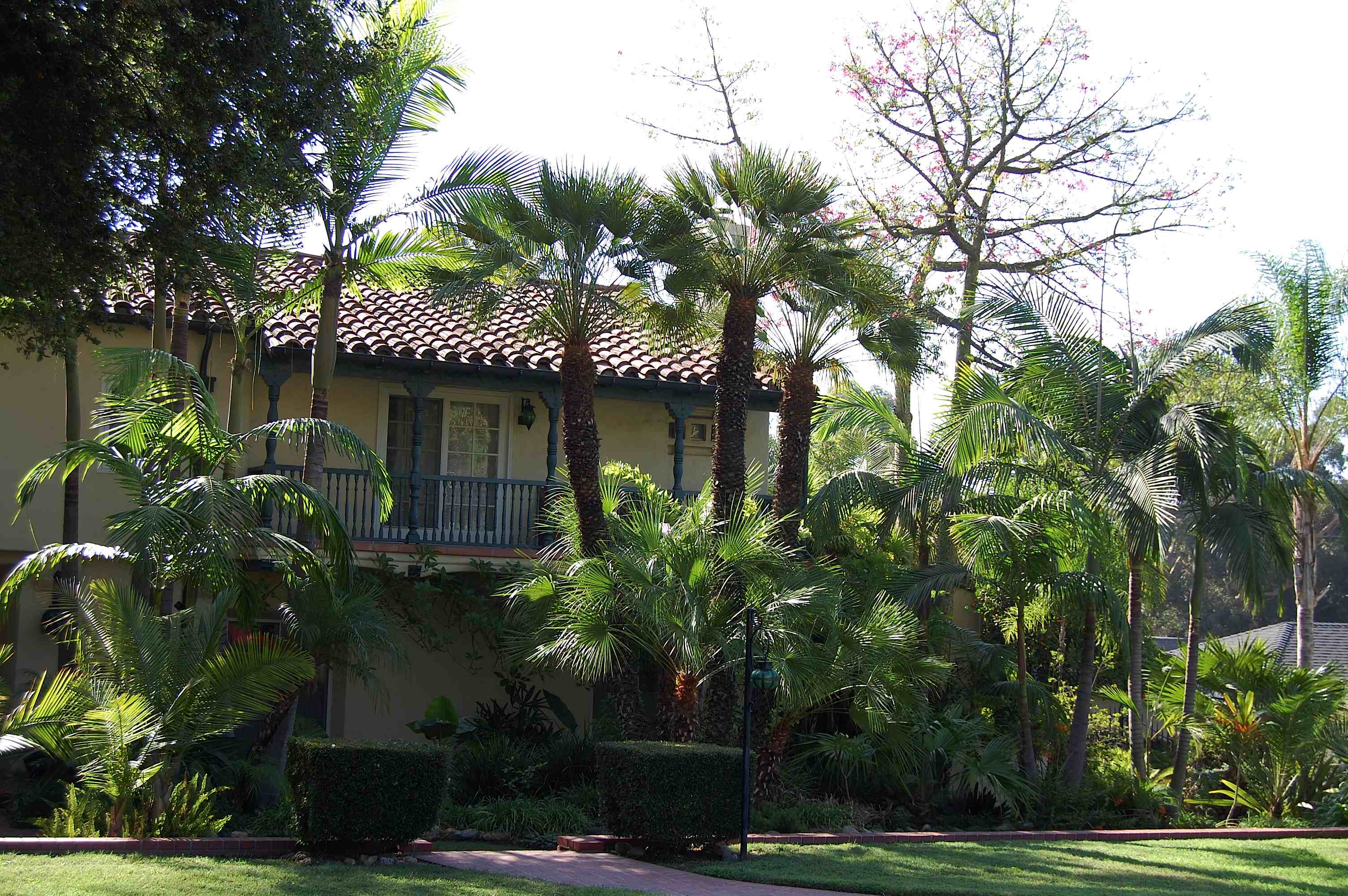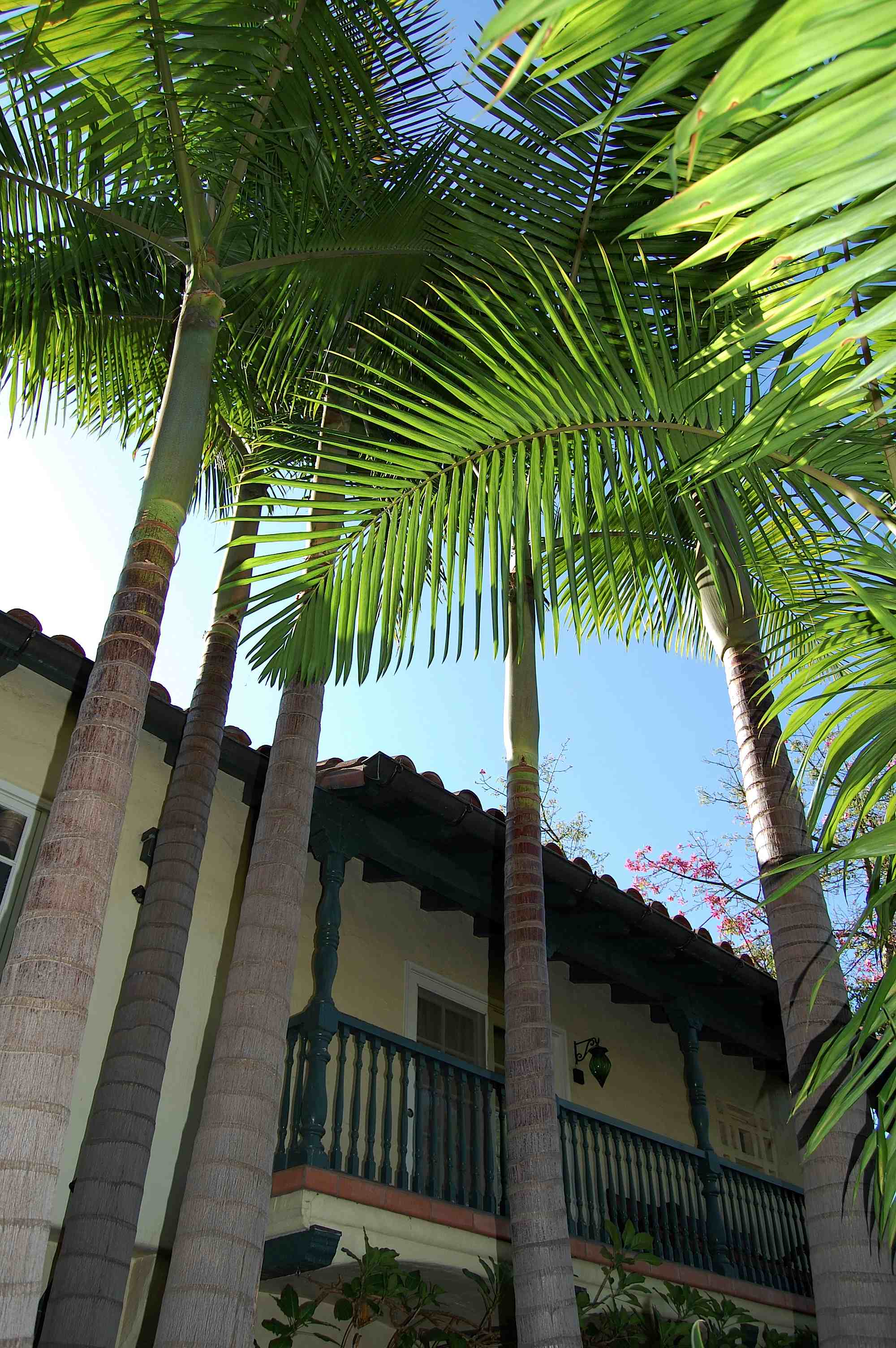The Spanish Colonial Revival home, built in 1928, has Monterey-style balconies front and back, and preserves many of the original details. Tall Archontophoenix cunninghamiana complement the home with their height: