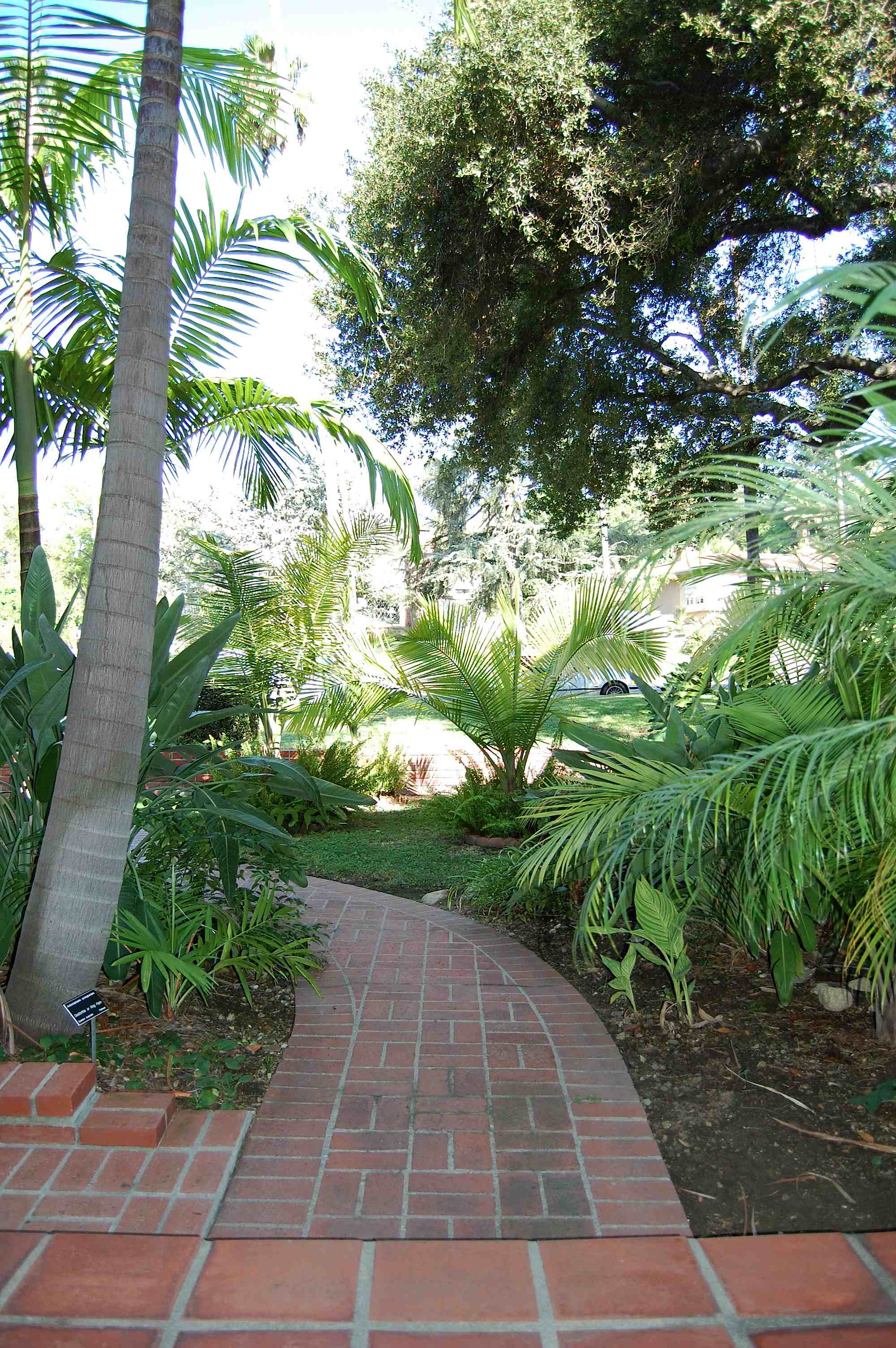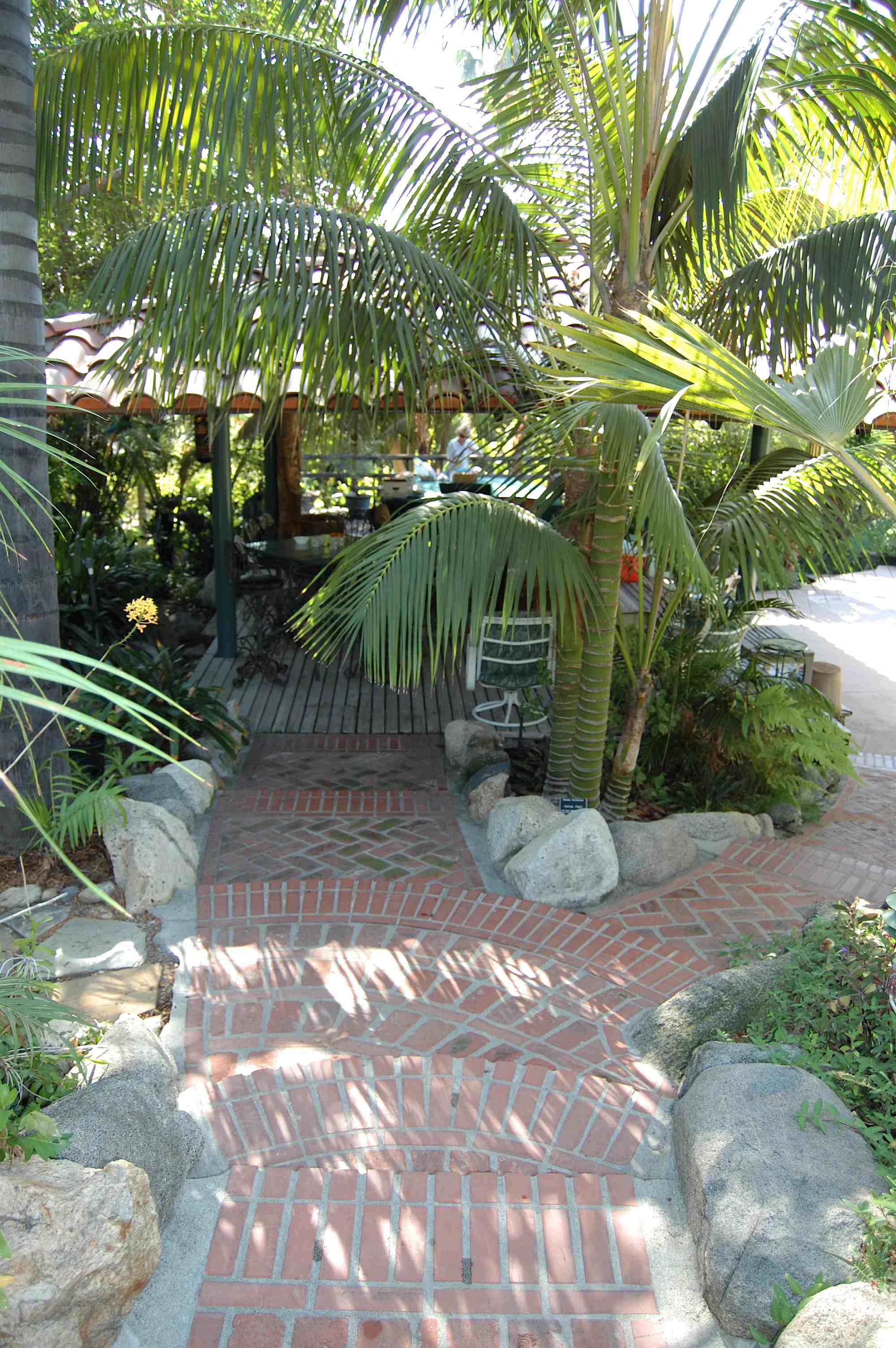 Livistona chinensis dominating overhead... A bend in the path -- how many different kinds of leaves do you see?
