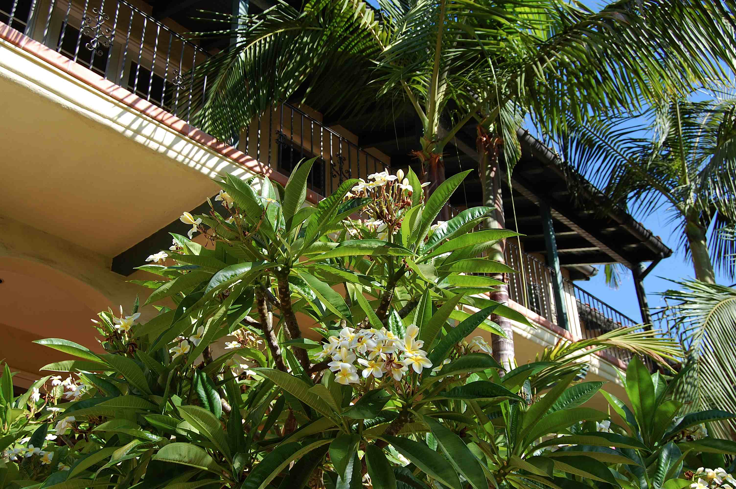 The back of the home features a tiled stairway perfumed by robust plumeria bushes: