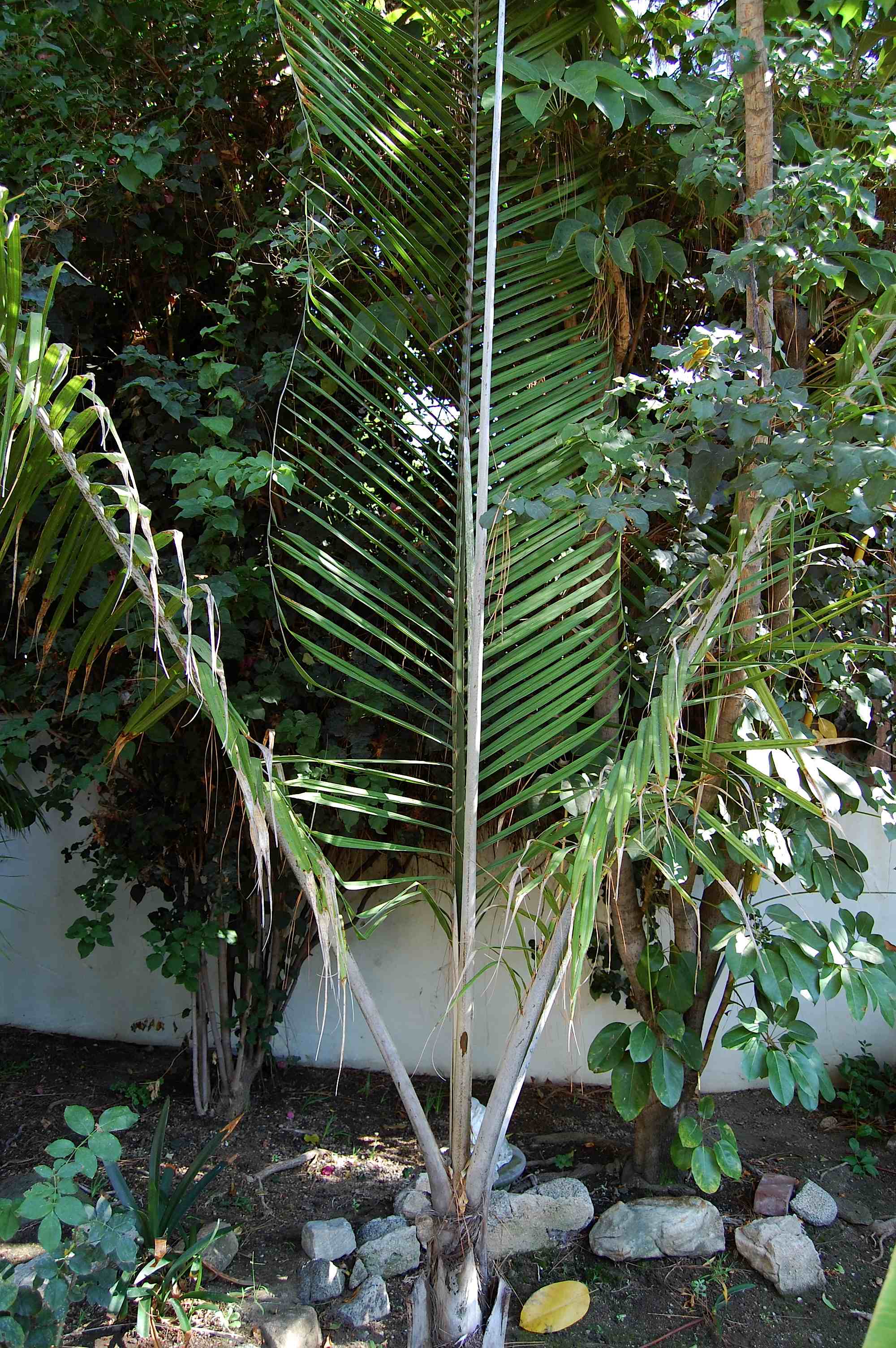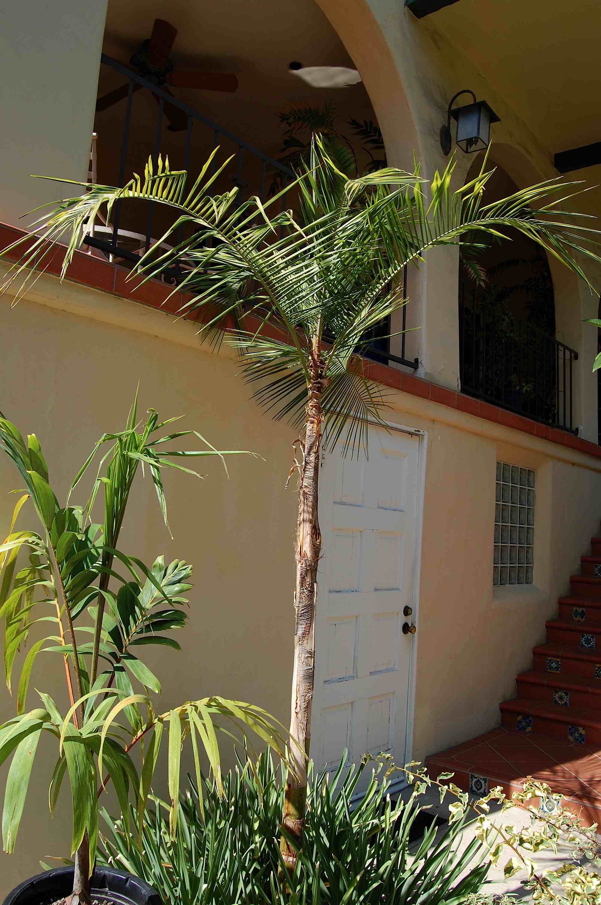 A young Cocos nucifera is sheltered in the alcove; a potted Syagrus botryophora nearby: