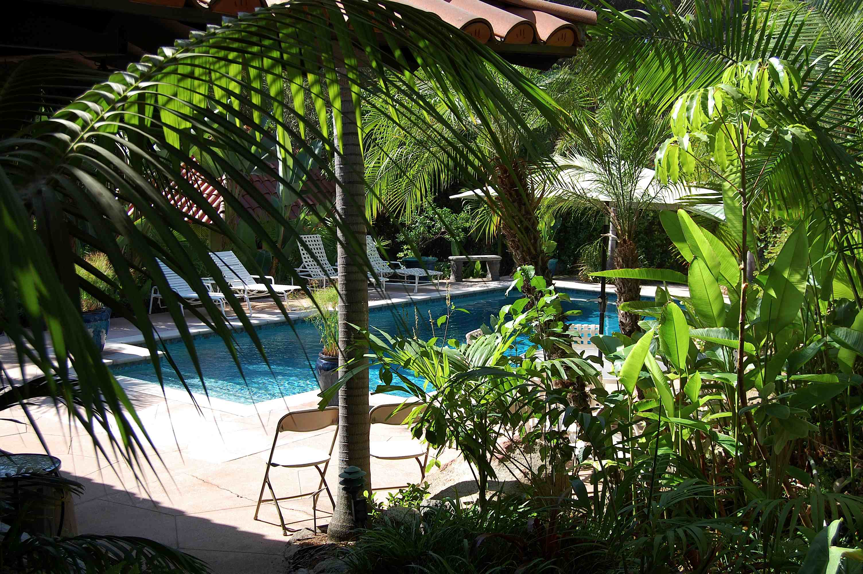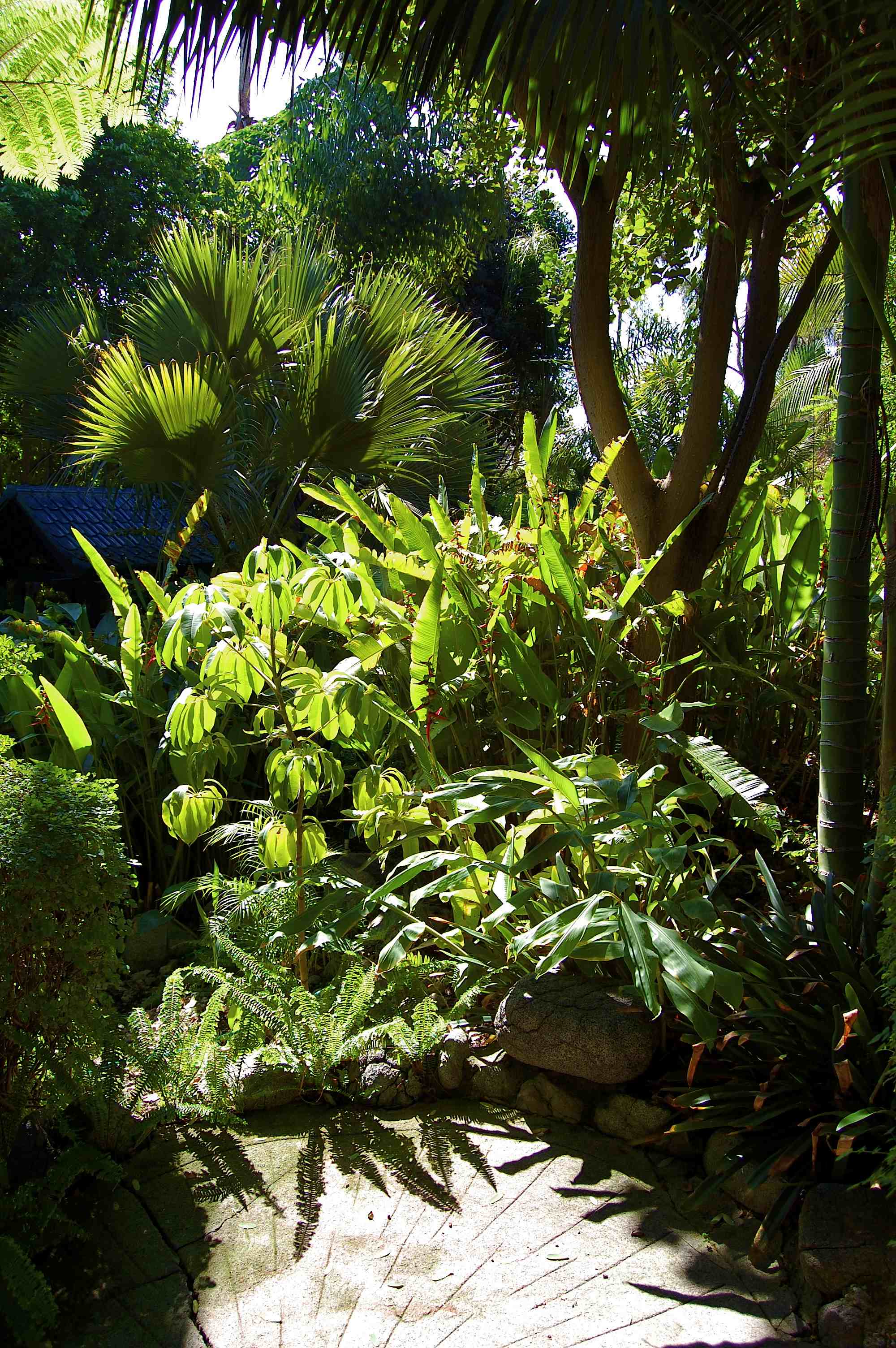 Flowering tree (please supply name) and tree fern overhead... Pool with palm shadows...