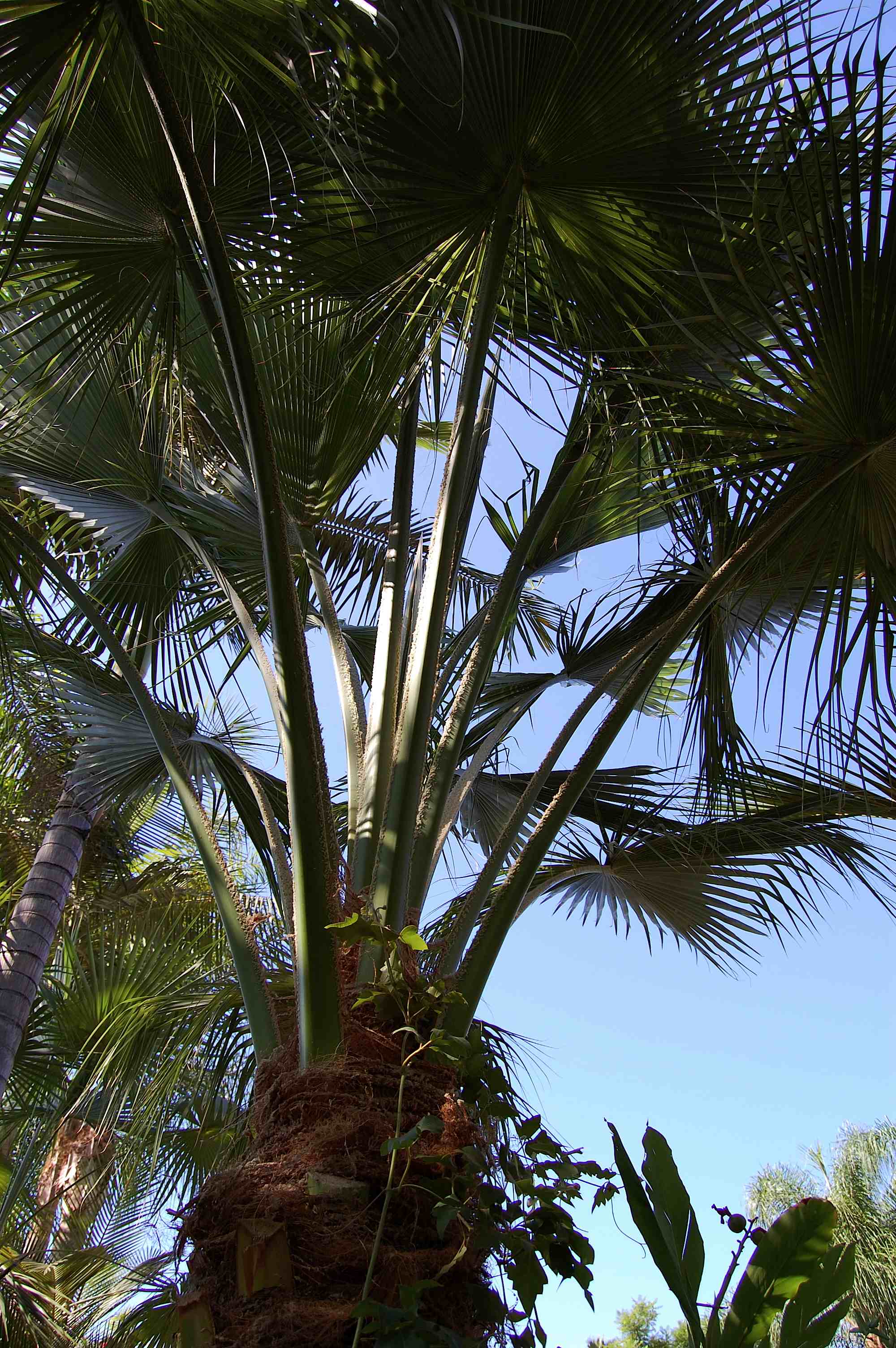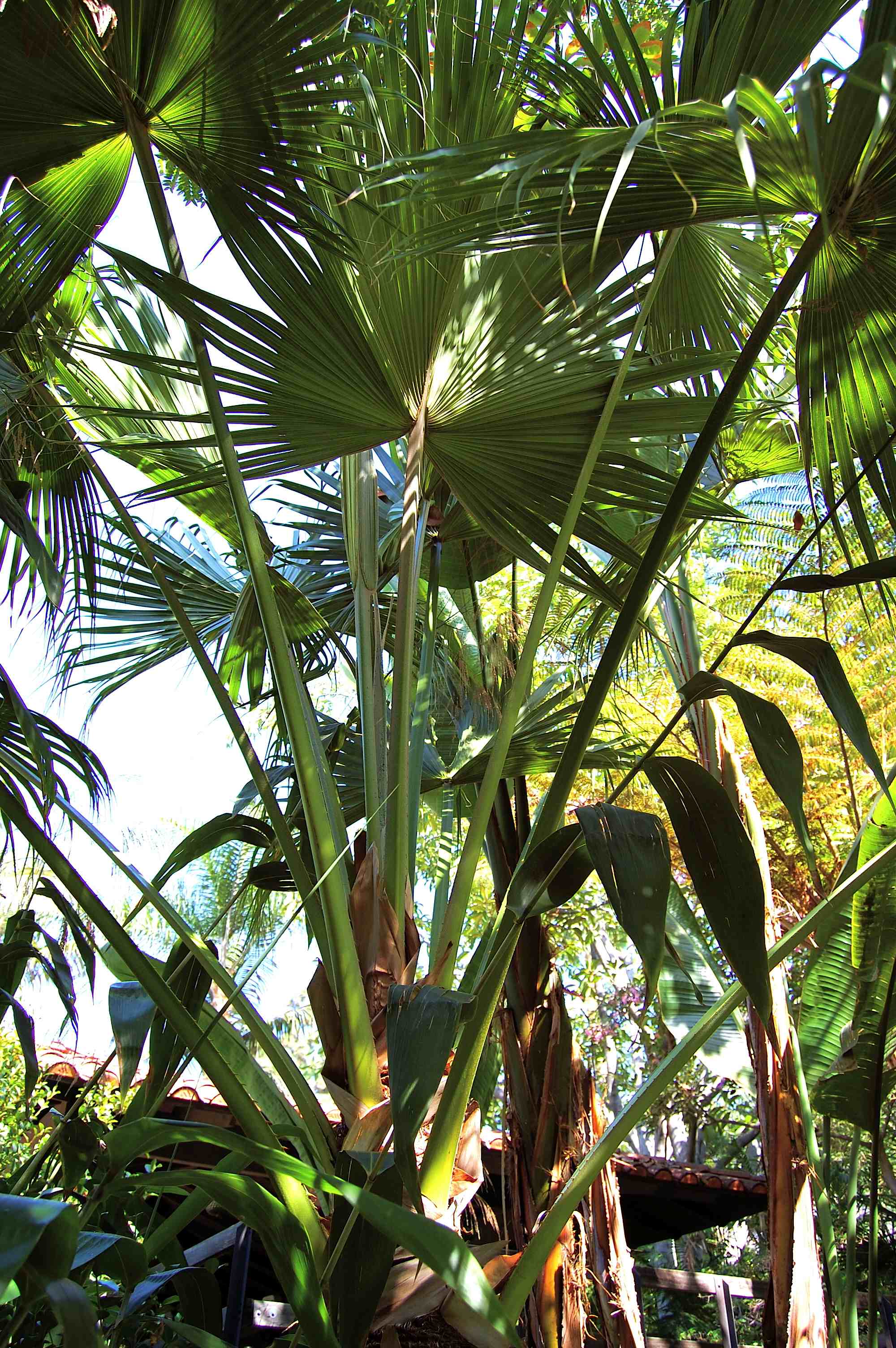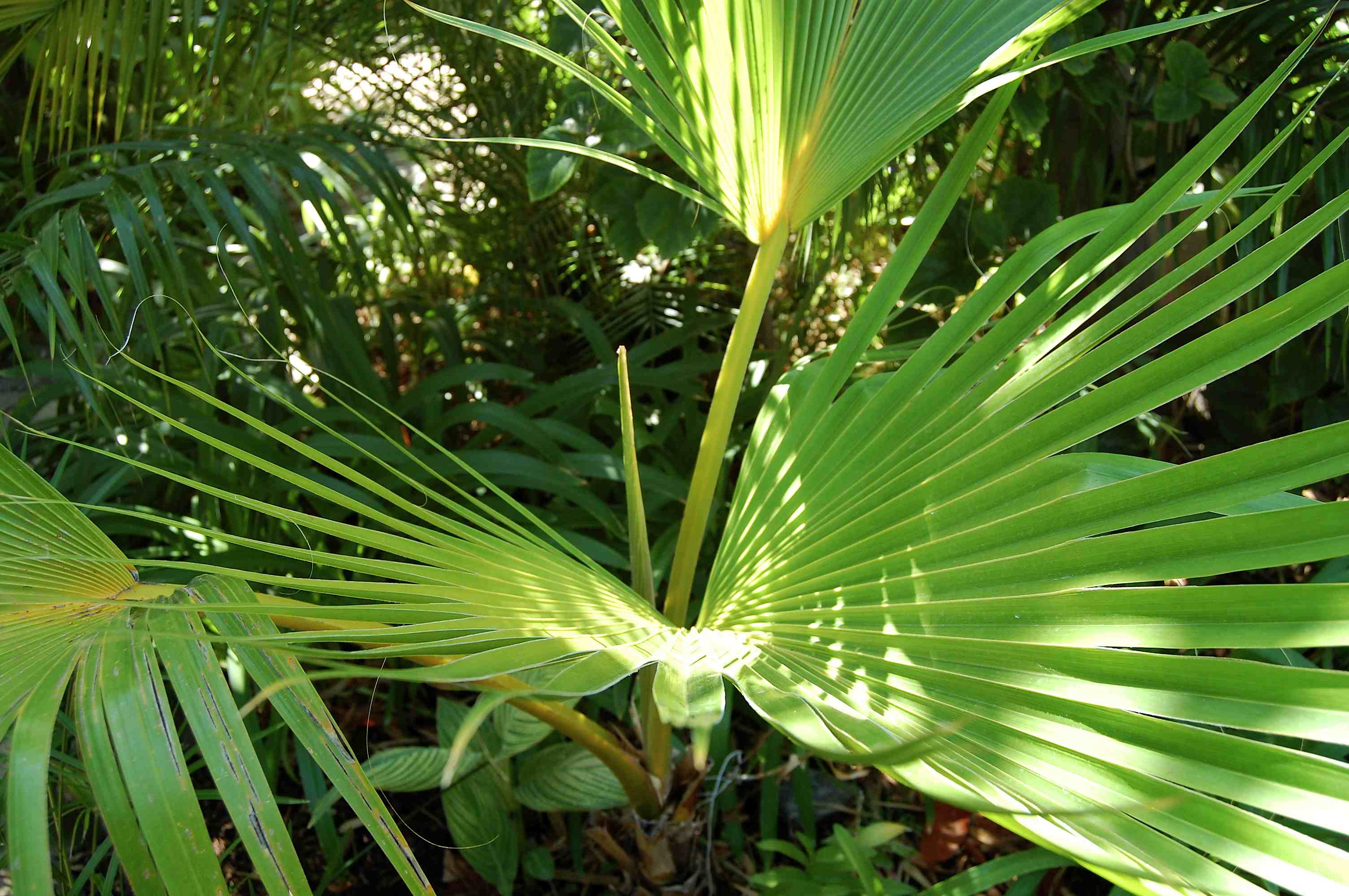 Okay, back to palms! A mature Livistona australis lights up the sky, and multiple Thrinax radiata fan out in human scale: