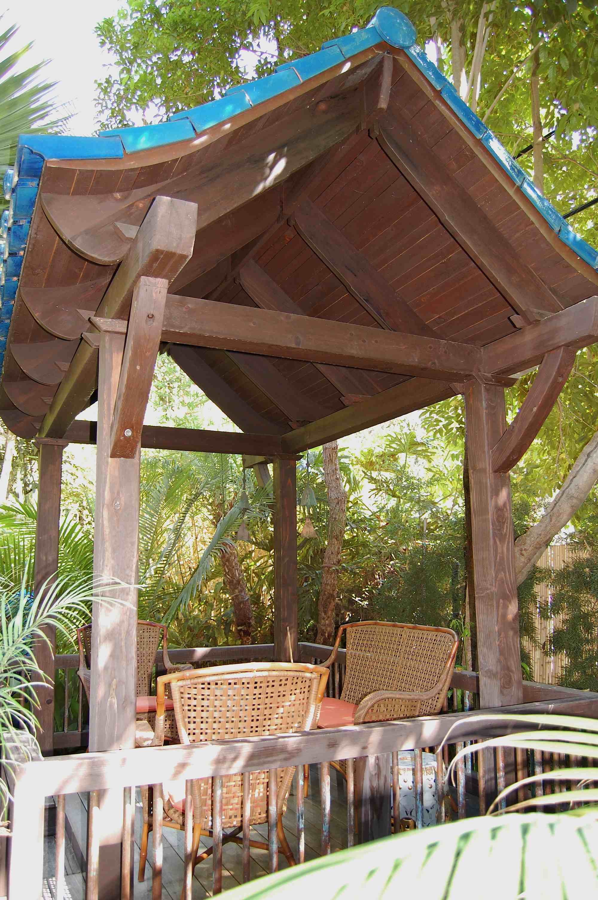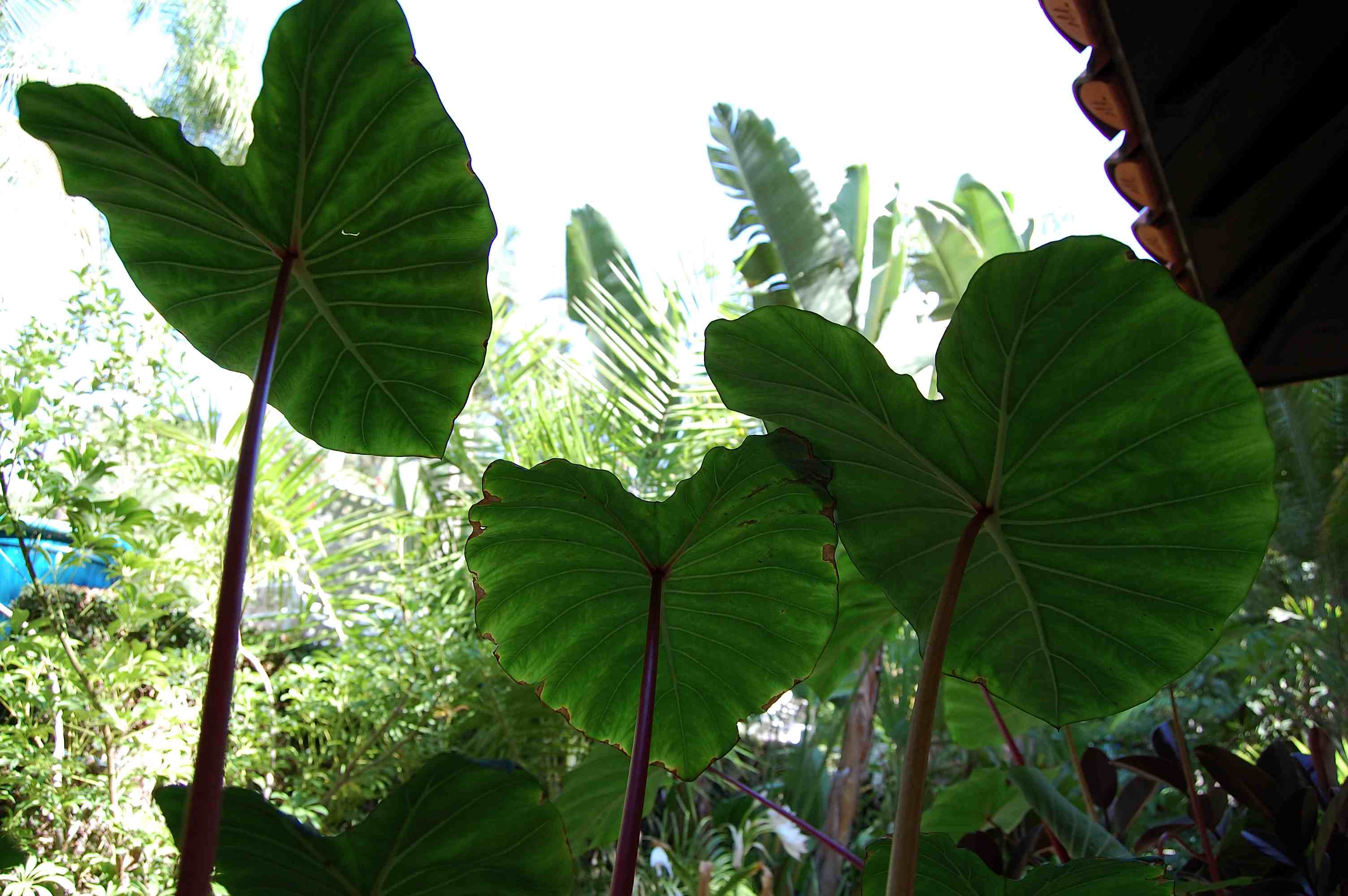 Steps lead us down to a covered deck; to the left is a fountain with water lilies and koi; to the right is the pool, as viewed through a drooping Howea leaf.