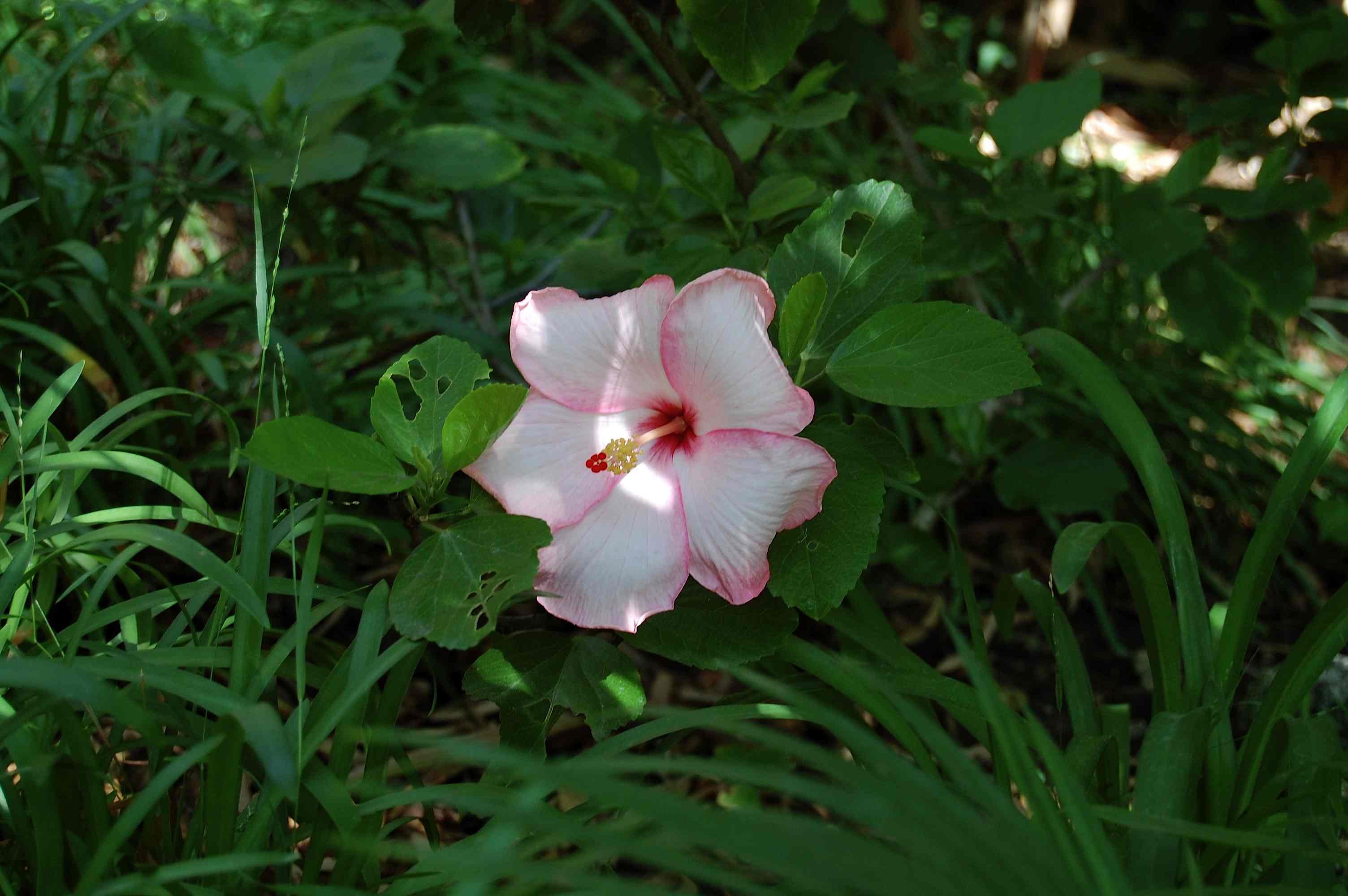 A crinum lily flower nodded... while the aroid leaves stood bolt upright...