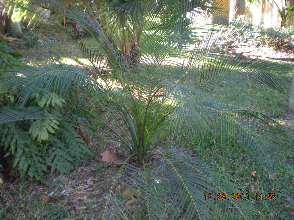 Mine has been growing in filtered light (under a C.I. date) for about 7 or 8 yrs. These are very slow, this one has a 5 to 6 ft spread if that, the stem has stayed below ground as well so you have to go very easy on watering or the new leaves will rot some. One of the many "plant then ignore" cycads for here.