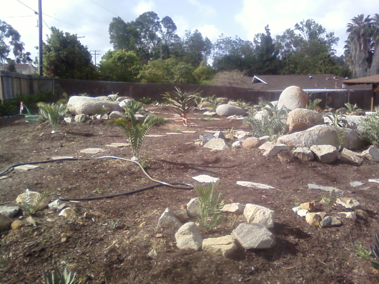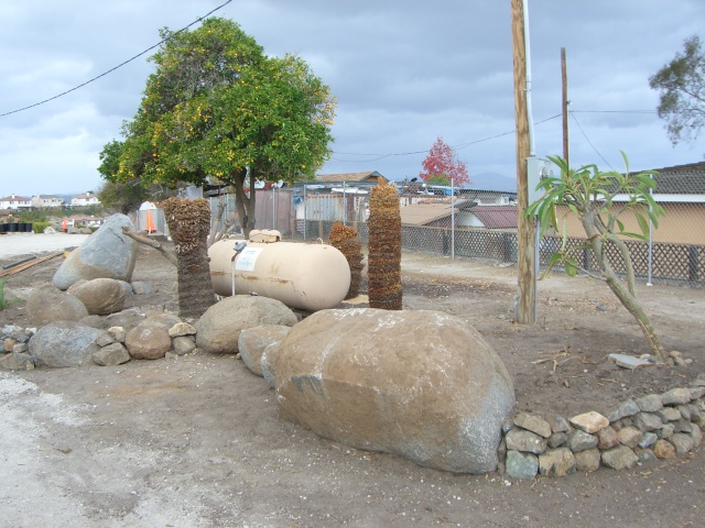 Getting back to our project, it has been a very chalenging, expensive, but fun experience for our whole family. We are working very hard and seeing wonderfull results for our labors, and to see each one of our visions becoming realities is extremely satisfying, especially Bradens creative landscapes and unique plant choices. He moved several large granite boulders and placed them around the property and created a very natural environment with colonies of cycads, agaves, yuccas, aloes, proteas,and many more native and exotic plants that will flourish. Before any of the landscapeing and nursery stocking took place, the cleanup was a HUGE undertakeing! We spent about a week chainsawing dead and neglected trees, about a dozen rat infested washingtonias, half dead queenpalms, and other drought stricken fruit trees. The front yard was covered in over grown bamboo and about 40 phoenix reclinatas rooted thru boxes. The rest of the land was covered in every kind of junk and debris(old car parts, trailers, oil drums, stacks of sheetrock, telivisions, electronics, piles of old lumber etc.) It seemed very daunting at the beggining, but we went at it and never gave it a doubt.