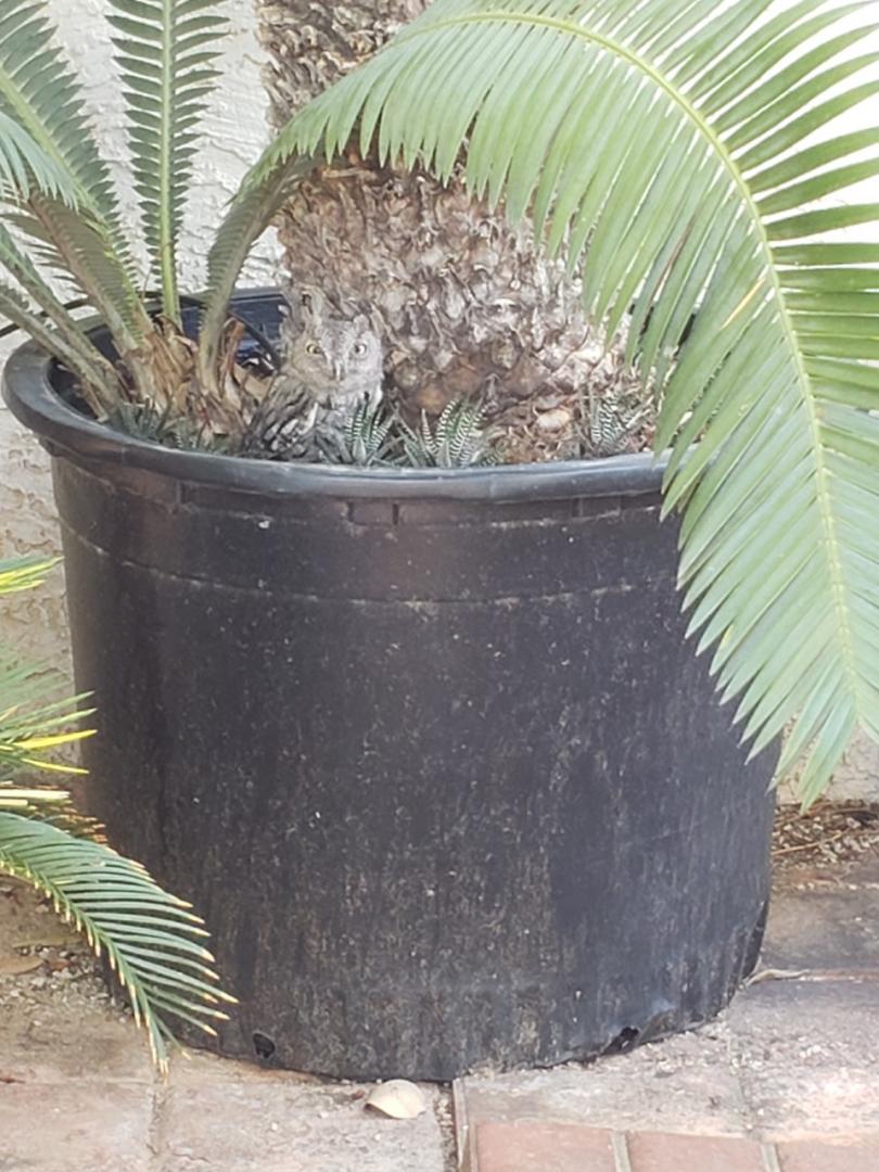 I don't know if this is a Pygmy or Screech owl.  It was only about 8 inches from beak to tail so I'm going with Pygmy.  Sitting in Dioon mejiae 55-gallon pot.