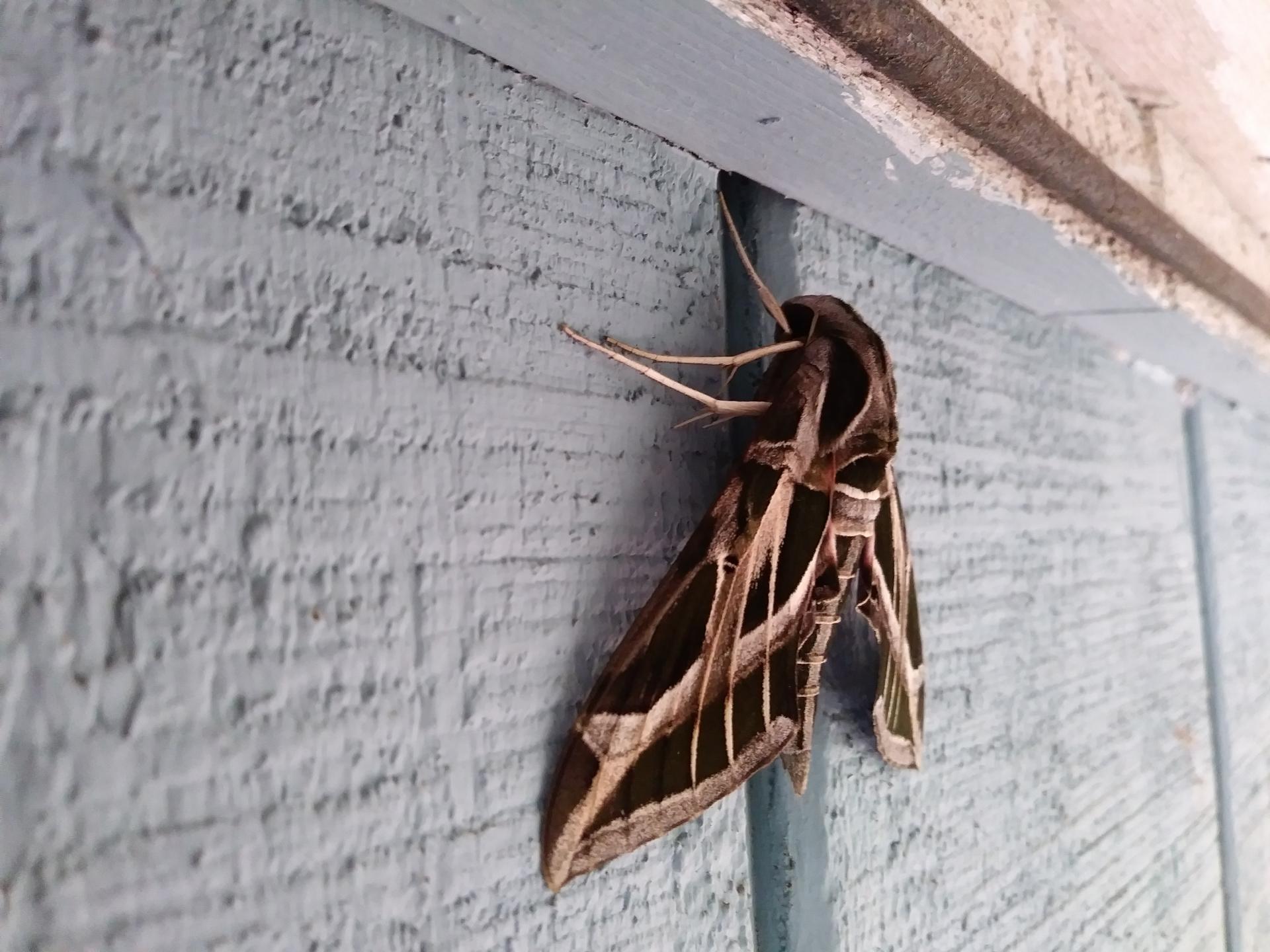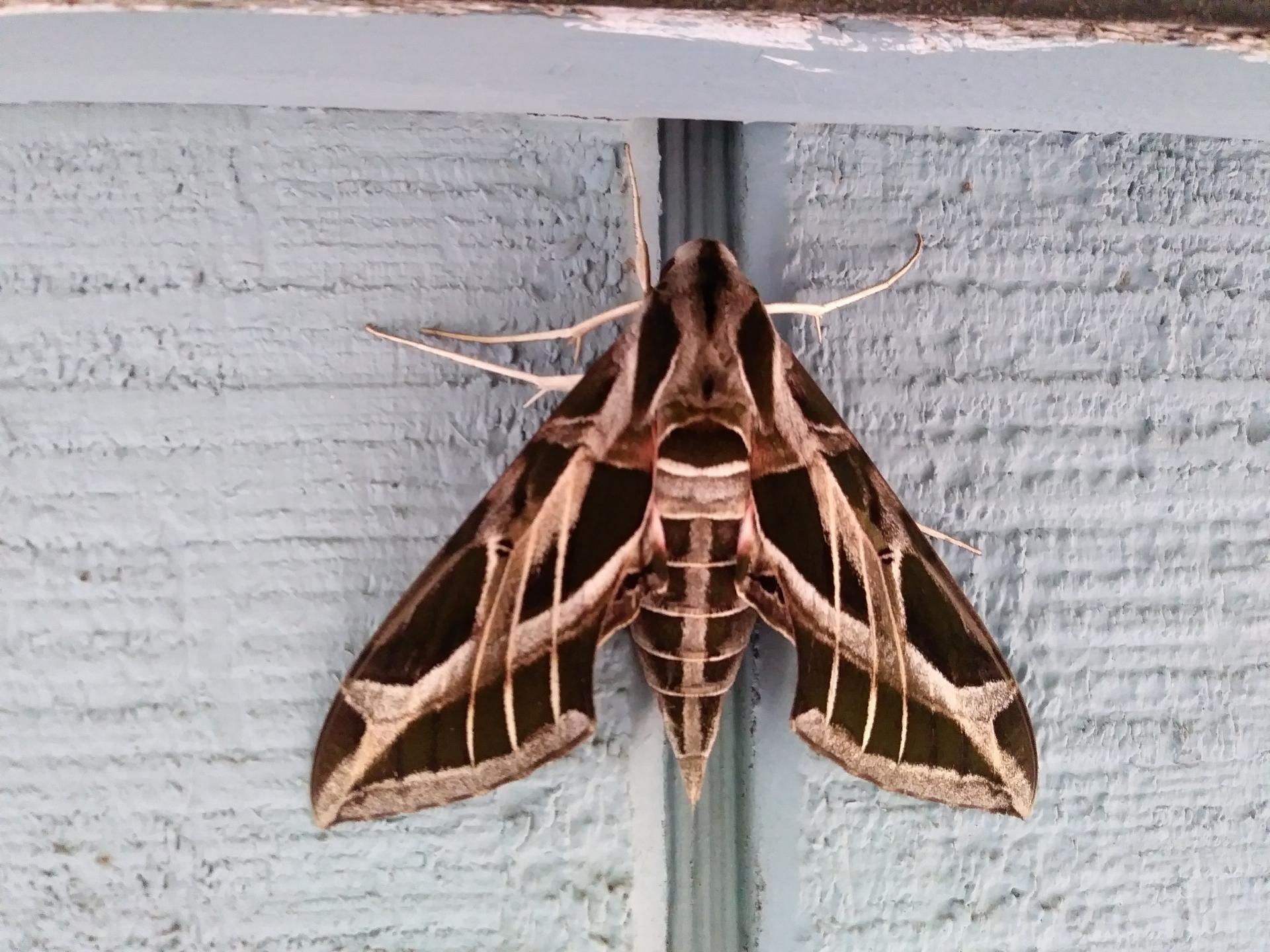 First is a Vine Sphinx - Eumorpha vitis.  Kinda looks like a jet.20210902_075002.thumb.jpg.3c8ab697a7d2a591d4d377562faa6f00.jpg