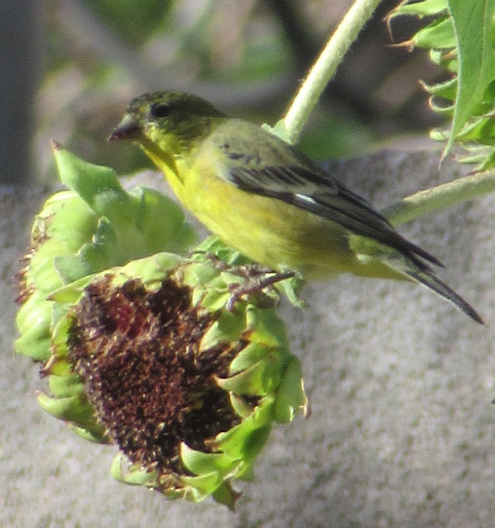 Lesser Goldfinch ( maturing male ) enjoying the last of the backyard Sunflower buffet.