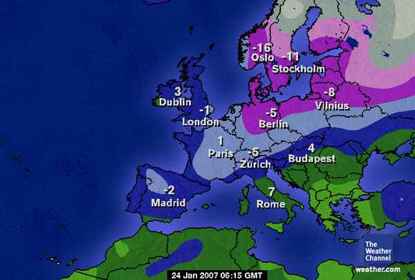 As you can see from the image below, much of Europe is suffering a fairly cold spell.  Fortunately, it's not been as bad here as forecasted.  It's supposed to be snowing here, but just a little light rain with temperature just above freezing.
