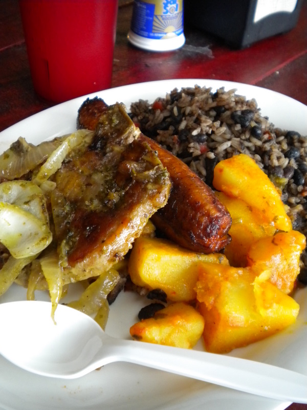 pork chop,beans & rice,& plantains.really hardy & good in that "down-home" way.