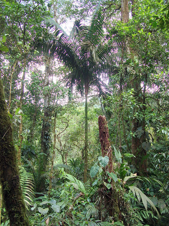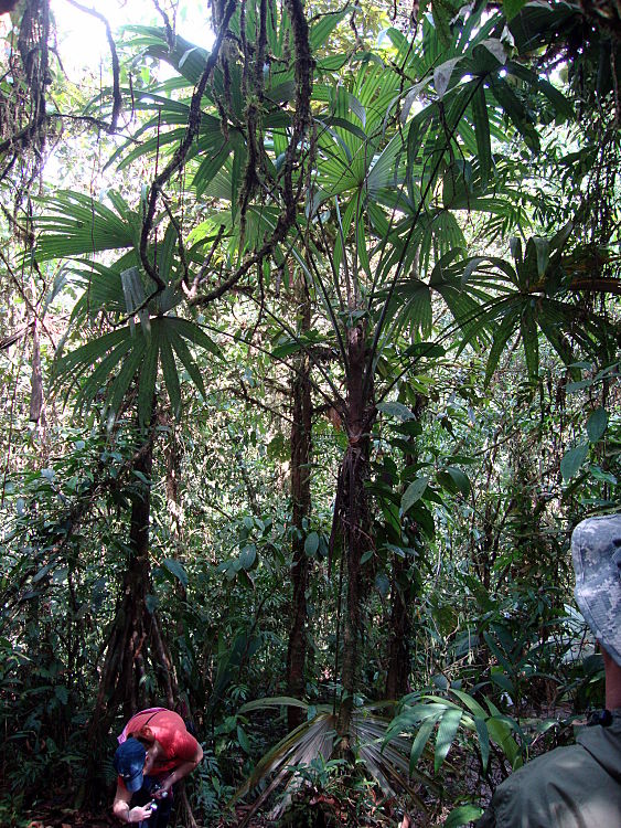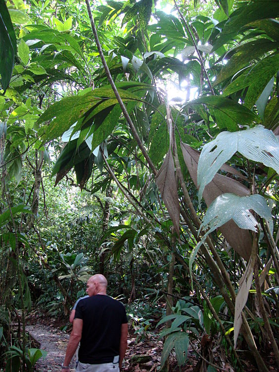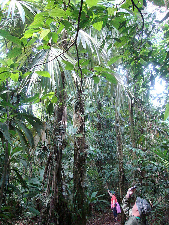 Looking up at Iriartea deltoidea poking through the canopy of this huge tree