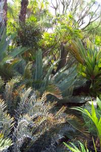 Following the traversing path, we see Howea forsteriana fruiting, the crown of a Brahea armata (I think) flashing silver blue, and the morning sun calling our attention to a bright begonia and young cycad with brilliant backlighting.