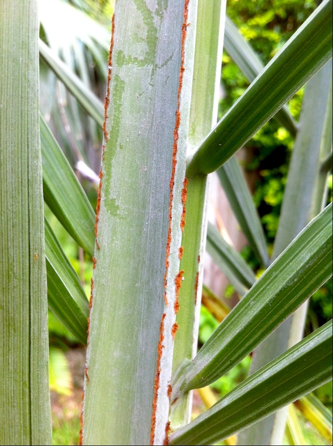 Also, the reddish coloration changes dramatically through the lifespan of each leafbase, starting with a light pinkish tone when first exposed, then maturing to dark reddish, then to brown as the leafbase begins to absciss.