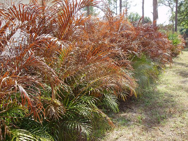 Regarding Dypsis Lutescens: I live in Golden Gate Estates which is due directly east of Naples, FL. This area is clearly marked zone 10A on the USDA map, however on the night of Jan. 21 to the morning of the 22nd I had a reading of 27F in my yard, along with heavy frost. :angry: The official reading for Golden Gate Estates was later announced as 27F from the Naples Daily News. I'm not positive on how long it dropped below 32, but when I came home from work that afternoon all 108 clumps of my Arecas had significant damage. I would say 90% of the foliage turned some shade of brown. Fast forward to right now (Feb 6th), and it seems that most of the stalks will be OK, and that the damage was mostly aesthetic and that new fronds will eventually take over the dead. New growth from the spears are re-emerging, green, and do not pull out. The stalks themselves are still firm and not squishy.