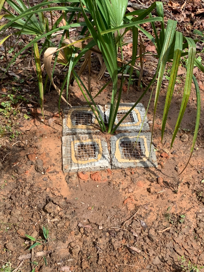 So beetle season is just starting, and I don't know for sure how this is going to work, but early indications are that it is effective as long as the edges don't wash out.  Last year I lost I think 5 palms and one or two are questionable.   We killed 38 beetles.  All my palms are S. palmetto, which I grow myself from seed.  This year I had twenty 5 gallon Sabal palmettos that I should have planted last year, but I wasn't ready to plant them.  So they were extremely root bound.  I made 20 of these palm fortresses.  Each palm fortress consists of four 7x7x1.5" square tiles with a 3x3" hole in the middle, and there is notch in one corner that is 1/2x1/2".  In the center is a 6x6" square of galvanized hardware cloth.  These tiles are made from concrete, and the mesh is glued on there with Locktite (formerly PL brand) urethane construction adhesive.  So I made 80 of these tiles.  The reason I did this instead of using just the hardware cloth alone, which of course is going to be easier, is that I know from past experience with different barriers that the problem is the beetle will just crawl under the mesh.  Also, the palm will grow into the mesh and impale itself.  This way, the palm pushes out the tiles.  As it gets bigger, you can insert thin tiles in between and enlarge the central gap.