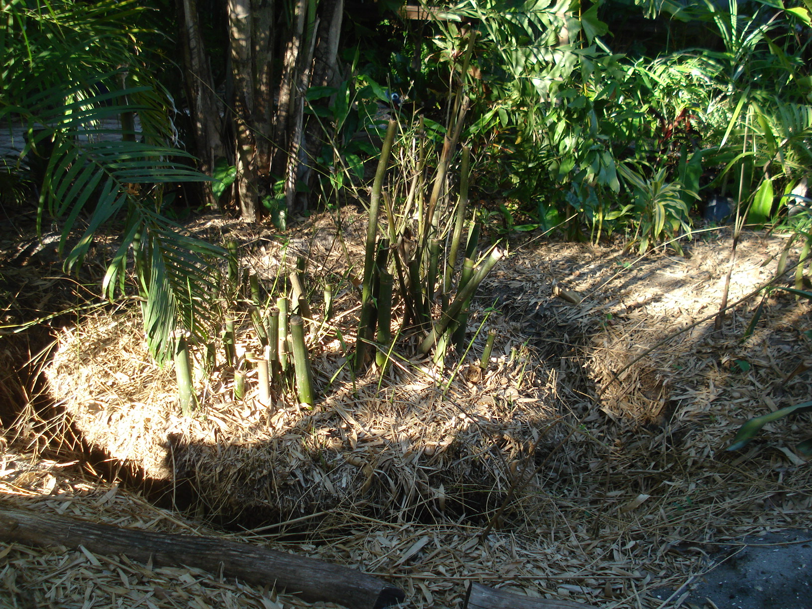 We have been busy removing a bamboo that was a little too aggressive for its space (Bambusa rigida) and planting the new area with palms, crotons, and bromeliads. First, the removal process...first I ringed the bamboo. Shortly after that, surprisingly, the whole thing turned brown. Then I began cutting out the canes.