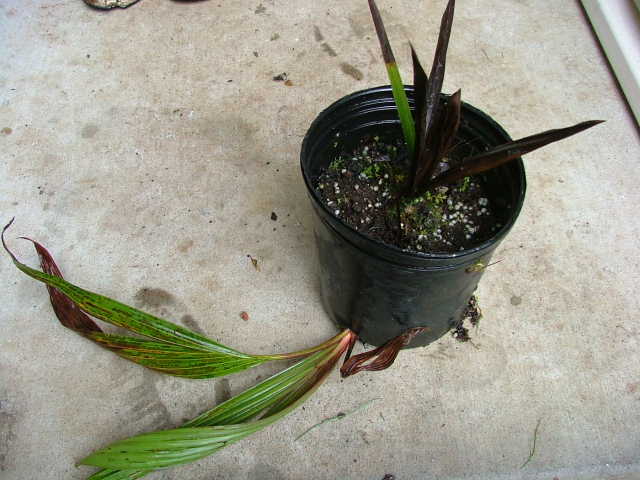 This Dypsis lastelliana, the last survivor of two batches of RPS seeds, was getting more water than it could cope with. Also I used a heavy "do not use for containers" Miracle Gro evergreen/palm soil. It was under automatic sprinkler system while I had to travel so I couldn't save the poor thing. I noticed that the leaves were progressively light green from oldest (OK green) to newest (truly white except the rachis(?)). Just before I realized the impending doom, the leaves started drying, starting from the tip of the newest then the whole leaf, then progressively to the older leaves. After it was done with the last leaf, I cut the plant close to the bud and there was still some non-brown tissue. Finally the whole plant died and it turns out it was root suffocation and rot.