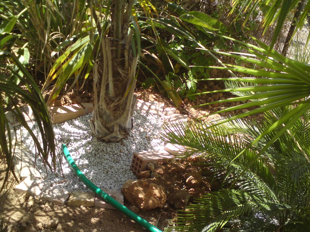 Darold, i think I get it now. Having looked at enough heeled palms I get the fact that the palm moves away from the heel and down. It would then make sense to plant the palm in such a way that the heel is uphill and the palm grows away from the heel. That way, even though it's growing down, it's actually pushing itself down the hill at the same time, so the sinking trunk is actually not a problem at all. Besides, it looks better since the palm will have slight curvature at the base going away from the heel.