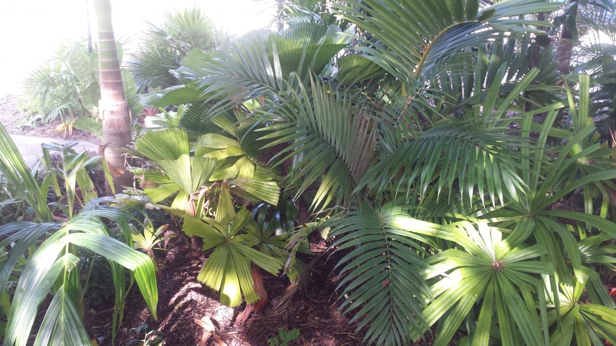The little hookeri in the back--this palm is sooooo hardy! Hardly any supplimental water, vines attacking it, constantly, nasty rocky soil and full South Florida sun! As such, the caliper on it is not up to potential, but it's still worth having, I say.