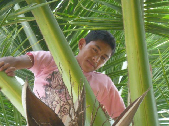 One guy up in the palm to swing with a very sharp machete after its been tied and slowly lowered down to avoid any accidents. The same goes for the coconuts before they come crashing down onto the tile roof or the skylight over my shower.