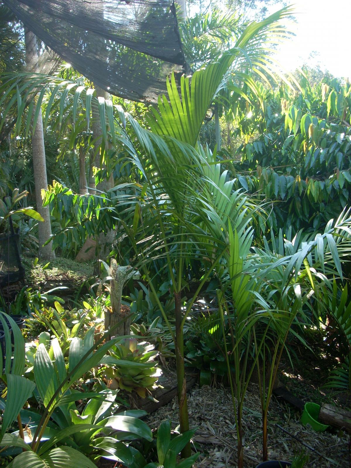 The small one right next to the Euterpe clusters are a Licuala Grandis... 1 year old..