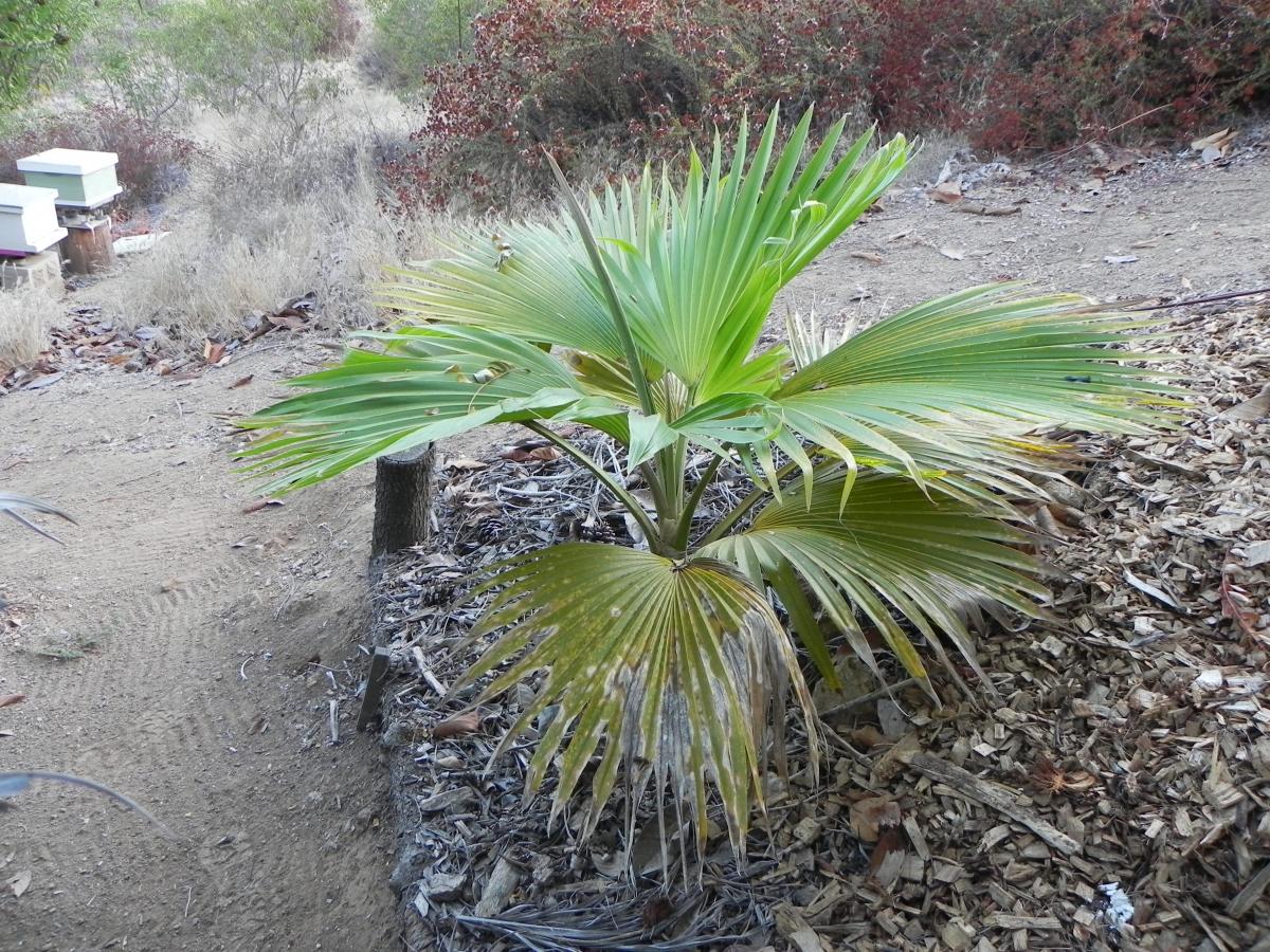 This palm was grown from seed collected by Paul at a dude named Kim's house in Clairemont area of San Diego. It's been slow growing and is finally starting to show that nice silvery underside that minor is known for.
