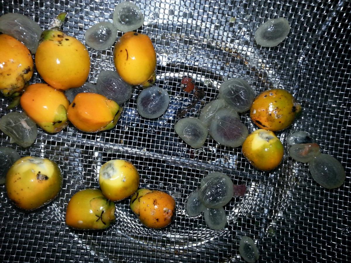 Regarding the seeds- the red ones resembeled a grape with a very soft outer skin and a black seed inside covered by a clear, slimy membrane. The Orange seeds had a tougher outer layer as they were not yet ripe. There appeared to be a seed cluster inside the orange ones in particular thar I divided with a knife - typically groups of three.