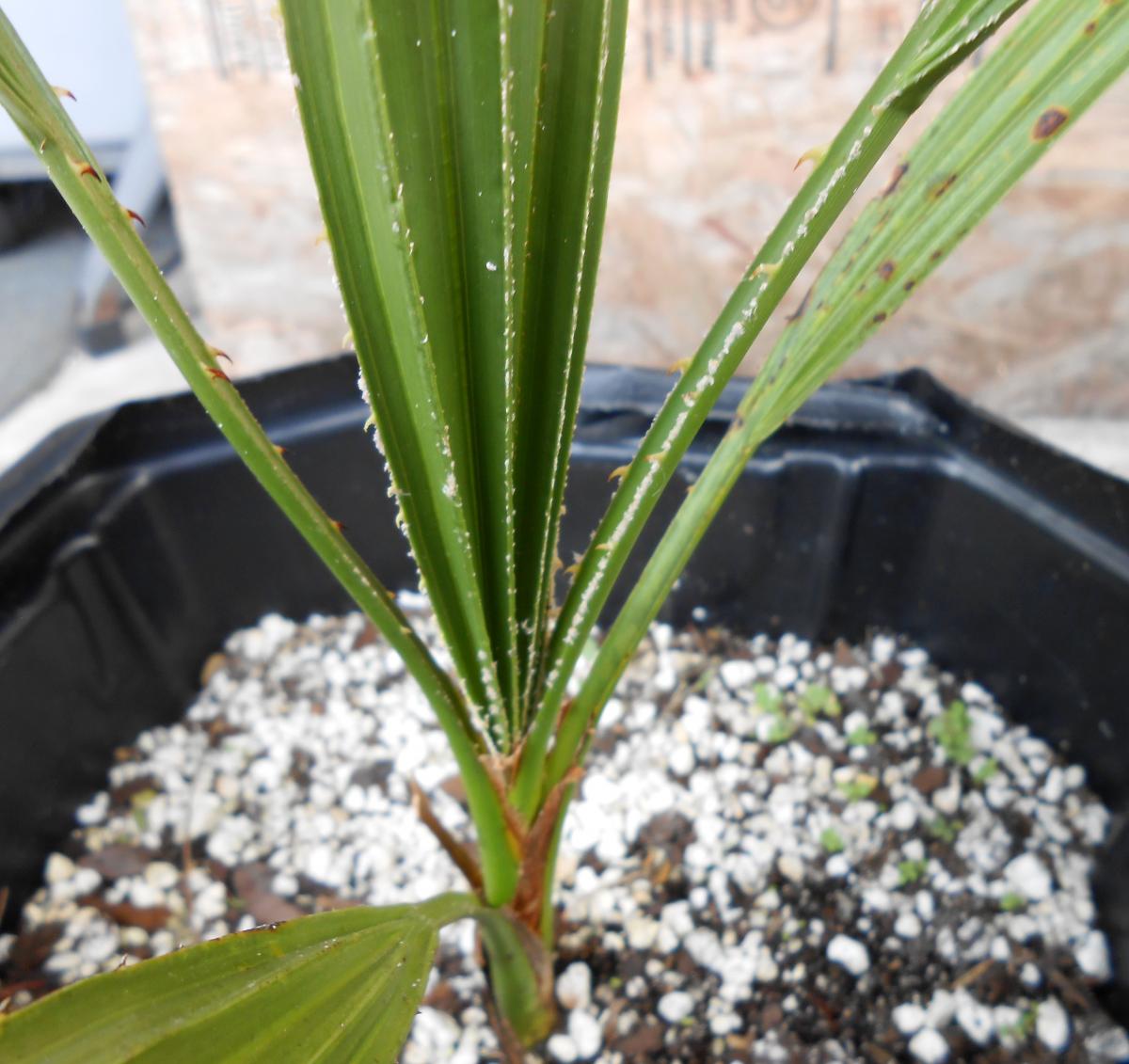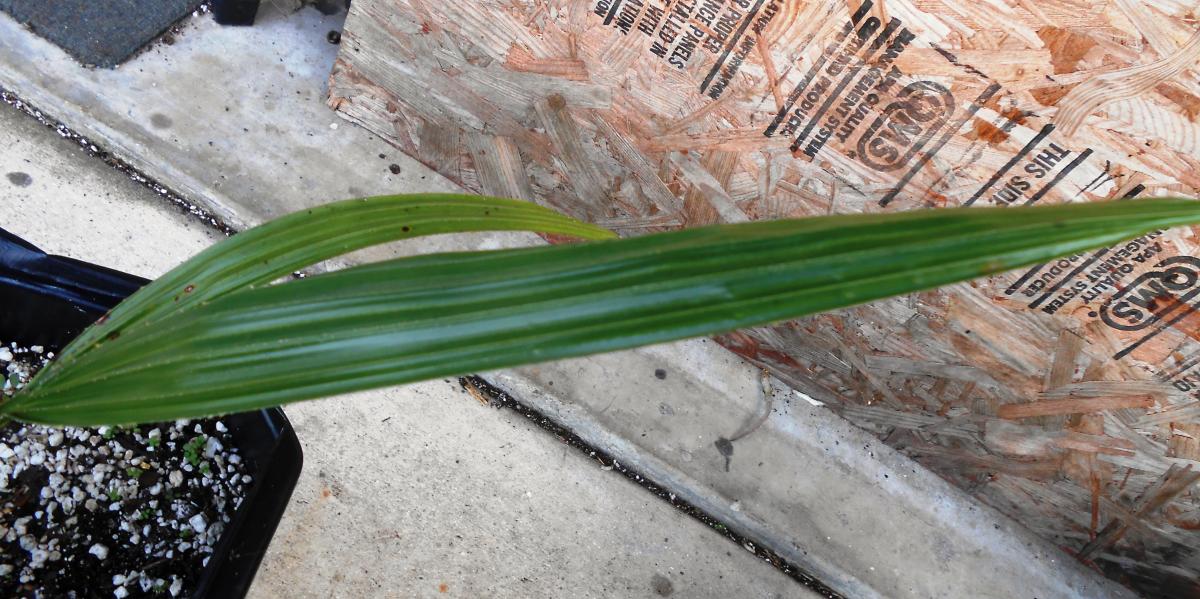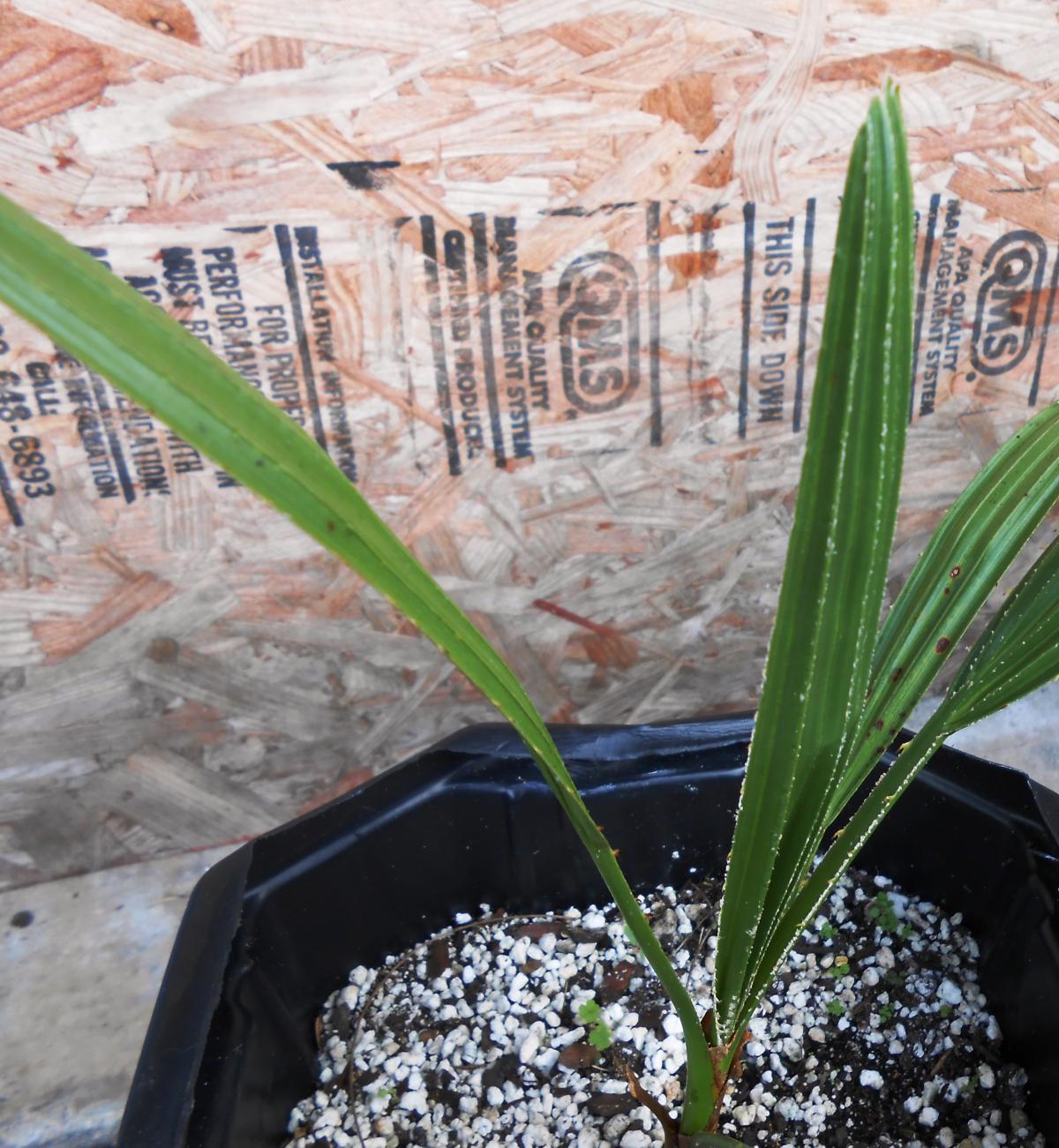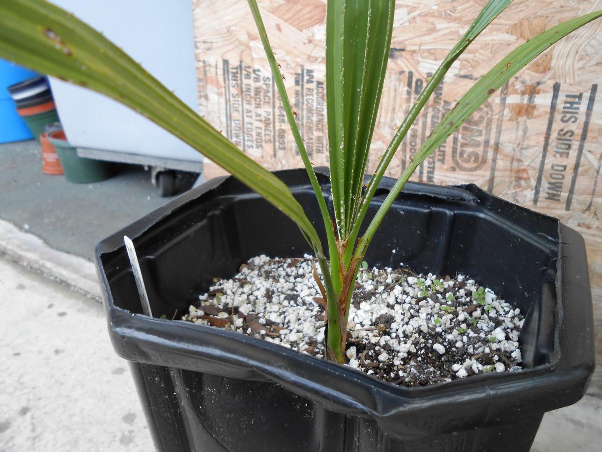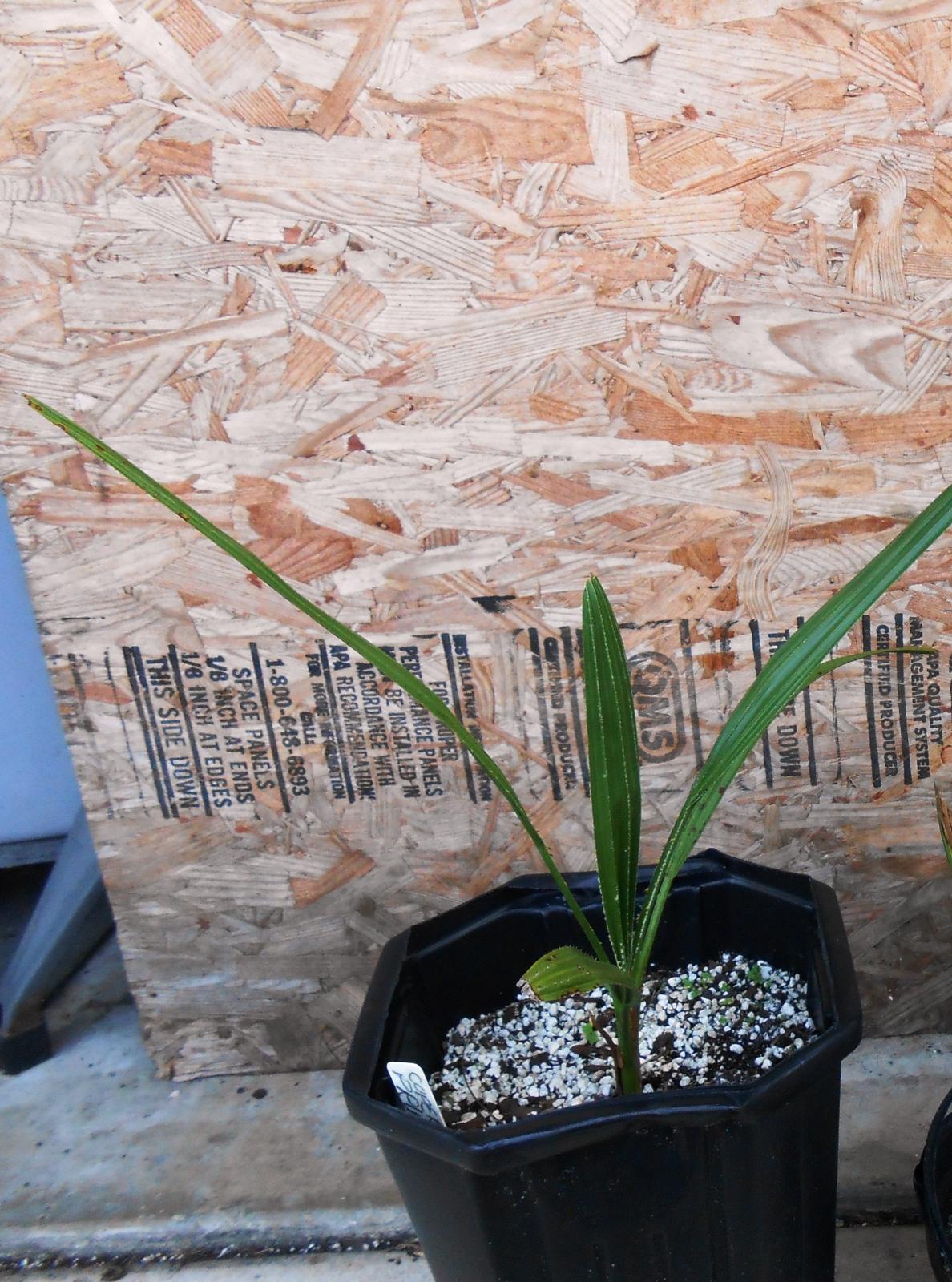 I'm trying to find new homes for palms I have no room to plant. This is my last Copernicia prunifera left from a group I dug up as 1-leafers at a Fort Myers palm park. I found them directly beneath the mother palm, which was identified as C. prunifera. In the Discussion Forum I requested identity confirmation from Copernicia experts. Consensus was that it was C. prunifera, possibly C. alba or a hybrid. As the mother was plainly marked and no other Copernicias were around I'm inclined to accept the ID. Unfortunately, I don't have a photo of the mother but I'll try to take one if I ever come across her again.