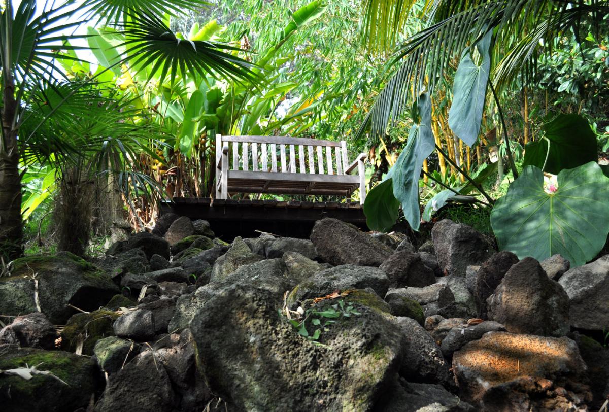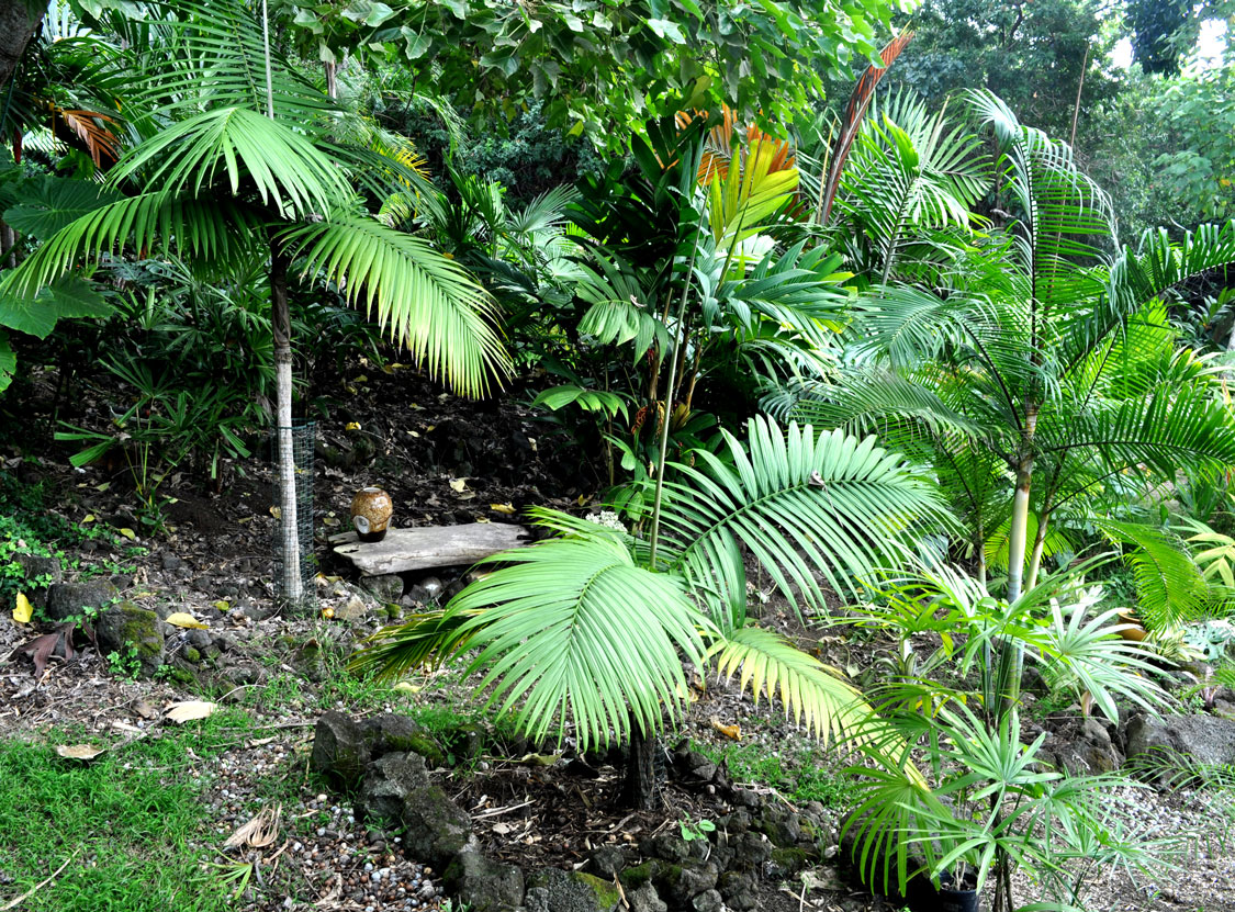 The still-to-be-finished platform below the calyptrocalyx and the bench is one of the places we like to sit after a hard day in the garden. We really enjoy watching the fading light slowly change the way the palm fronds look from below. The plastic box under the bench stores candles that we light when it gets too dark to see.