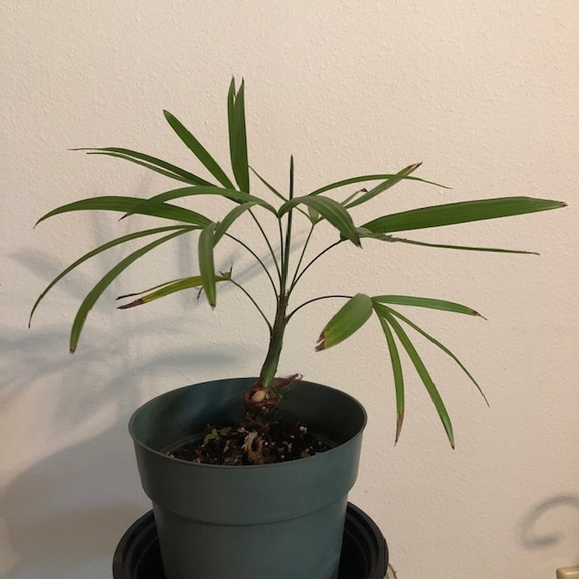 Late spring of 2017 I purchased a very small Rhapis.  Funny thing is I can not remember exactly from where. It could have been from on here, or it could have been Ebay.  What I remember about the purchase though is that it was separated from its "mother plant" and it needed time to gain some of its own roots.  Anyway, when I got it sometime in May/ June of 2017, it only had 3 small typical rhapis  "fan" like fronds, the largest of which had split into 3, divided down to the petiole.  Since then it has had its ups and downs.  The downs mostly were from little nibbling mouths of kitties eating back its leaves a bit.   I moved to South central west FL at the end of August 2017, and it found a home on my east facing patio where it got moring sun for several hours. (4-6)   Over the last year and a half it has seemed to  love its spot there, save for nibbling attempts from kitties, most of which I stopped and completely stopped when it got raised up on a plant stand.   It has grown very nicely, steadily, but its almost painfully slow.   It currently holds 7 fronds varying from 3-5 deep divisions.  The last kitty nibbled leaf is now the oldest on it.  The entire plant from base of trunk to tip of new spear stands 6 & 5/8ths inches.   I do not know the exact species of Rhapis this is, but I'm guessing it belongs to / is a dwarf.    Can anyone give a more concrete ID on this?    Much appreciated.  Photos below.