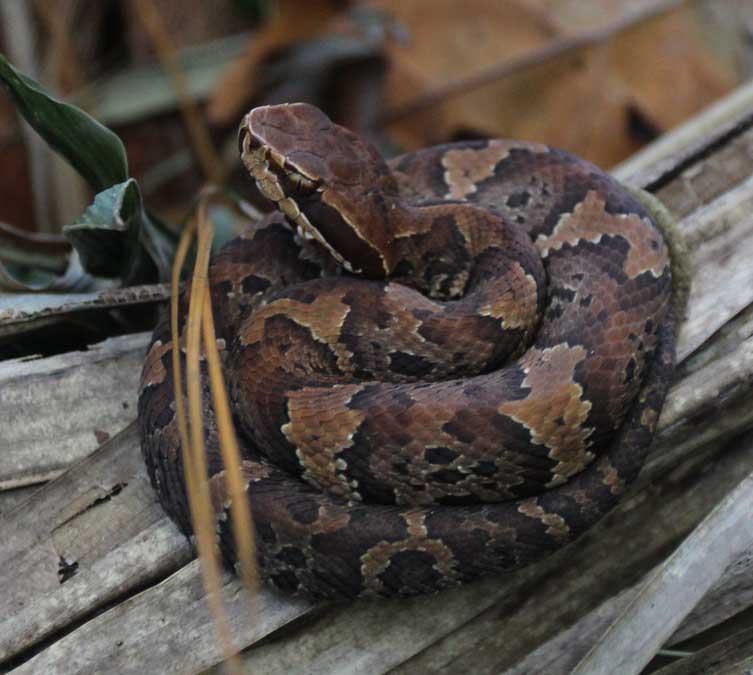 Nice Cottonmouth! Diamond shaped head, and the bold eye stripe are a dead give away. Curious how big it was. Surprised it isn't in defensive posture in the picts. Caught a 5 footer while visiting a friend in Texas a few years ago. Glad it was still too cold to move around much when I found it, lol. Fangs were huge!