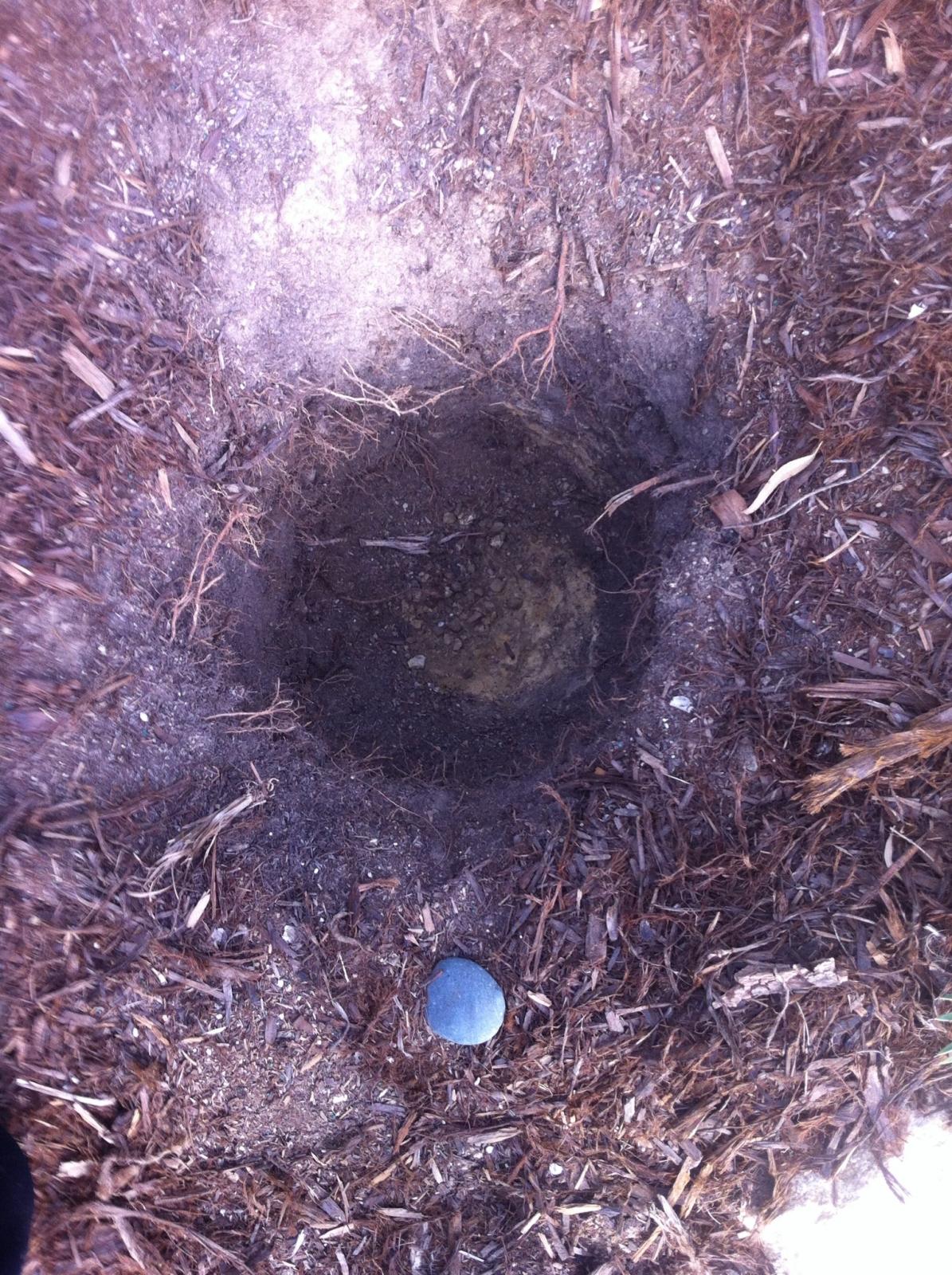 4) Once the root ball is in place in the hole, I backfill native soil only to 1/2 of the depth of the hole. I then take commercial organic soil amendment to fill the remaining depth of the hole. The idea is that water can more easily drain and pool in the upper half of the hole and slowly infiltrate the root ball while watering supplementally. I pop in one Lutz potassium deficiency spike to feed. Note that you should never fill the top with native soil, it can "lock in" the root ball, i.e. the water penetrates the native soil and follows the native soil only via capillary action but the capillary action doesn't jump the barrier between native soil and root ball so the root ball dries out.