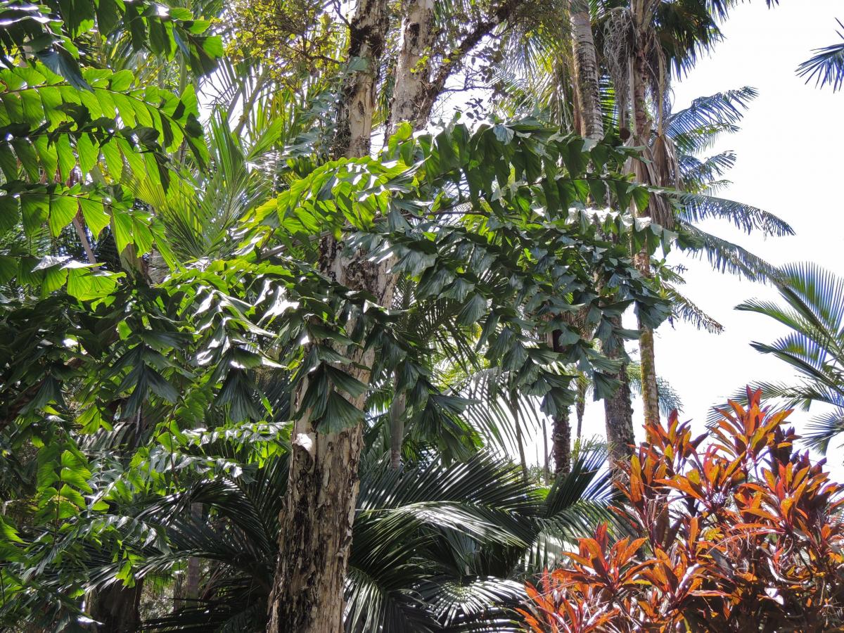 Now that Caryotas ophiopelis and zebrina have grown large enough in cultivation, an interesting leaf shape is becoming apparent that I was not aware of until I saw these in Hawaii a few weeks ago.... turns out these two similar species (separated physically only by one having leathery leaflets- C zebrina, and the other 'normal' leaflets- C ophiopelis) develop, with maturity, a plumose leaf (sort of)... in other words, the bipinnate leaflets these Caryotas come off in two different planes from the rachis... no other Caryota I have seen does that, that I know of at least. Younger palms of these two species do not do this... only when they mature do they develop this biplanar leaf shape... making these leaves some of the most complex in the entire Areceae... First 4 shots are of C zebrina, rest are of C ophiopelis, all in Jeff's collection.
