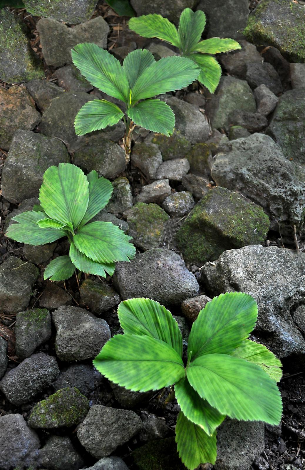 Row of 10 Dypsis minuta as a border, with Dypsis hiarakae on the left, Dypsis interrupta in the middle and Dypsis scottiana on the left. They are all in