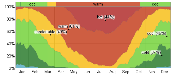 The graphs tell a lot about average temps and the amount of time in various temperature ranges. Another factor is in the daily temp range, where the temp may peak at 70*F for an hour at midday, but be in the 40-50 range during most of the day (typical of SoCal in winter)--or, like in S. Fla during winter, the temp may briefly drop to 45, but most of the day it is over 65.