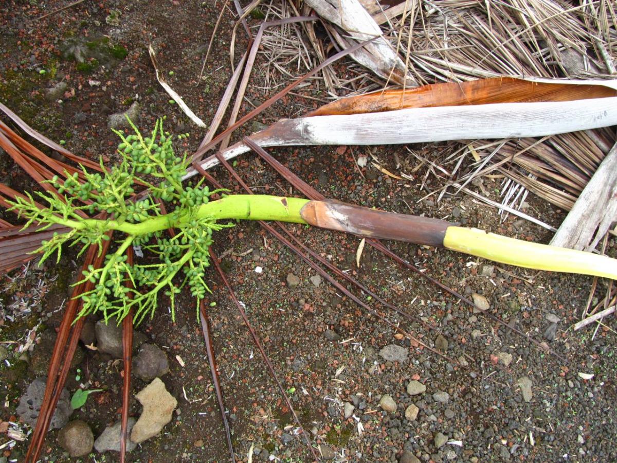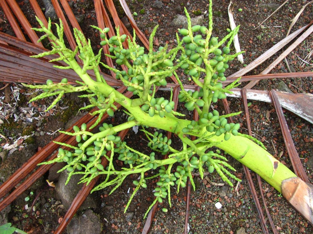 Tim, funny you mention an update as Bob De Jong was just over and said I should add one too. So I had pictures ready :) I would imagine looking at the size of the flowers and the length of the peduncle, that in places like Hawaii where they grow so much faster and shed old leafbases so quickly that they would have issue staying on the tree without support. I have found that many of the interfoliar flowering Dypsis will drop the flower from too much weigh if the old leafbases are not on the palm to help support the weight. It is hard to tell from the pic as there is no scale, but the flower is massive for a palm its size.