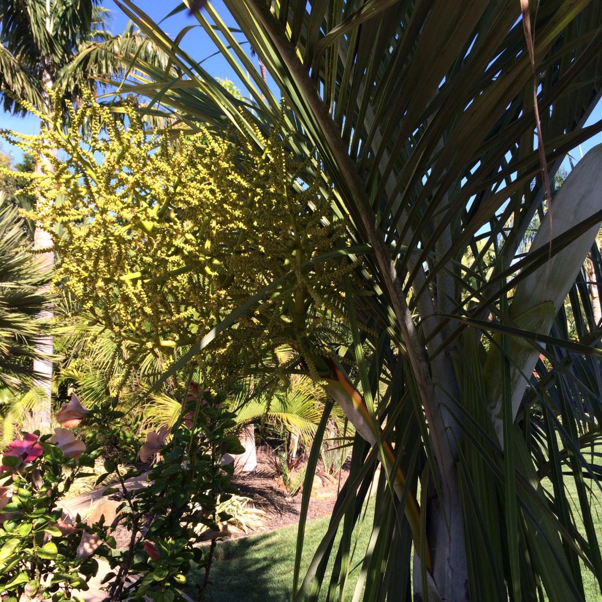 This crazy few years of weather has really been great for the palms. I just saw this today too. My Zombia antillarum is flowering! This palm is not easy to grow here. It really needs heat.