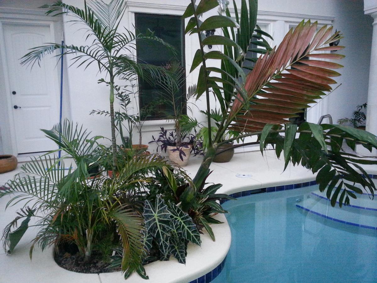 Don't be scared to have tons of palms of different species. Intermingle fan palms with pinnate ones and large leafed companion plants as well as colored leaf plants. Repeat, repeat, repeat! If you do bromeliads, repeat them in groups throughout the garden. Harmony is the name of the game and you need some commonality in the garden to achieve it. I used red iresine (bloodleaf plant) as a balancer and have large ones throughout my yard roughly 20 feet apart and several group plantings of Archontophonix everywhere. They've multiplied by seed and the groves are pretty dense now. I have 130 different species of palms (300+ total) on less than 1/4 acre and a large patio and 20,000 gallon fish pond and I'm still frequently adding new palms under the older ones so collecting species can be part of a pleasing landscape but I think its the multiple repeats of the king palm groves that helps pull it together.
