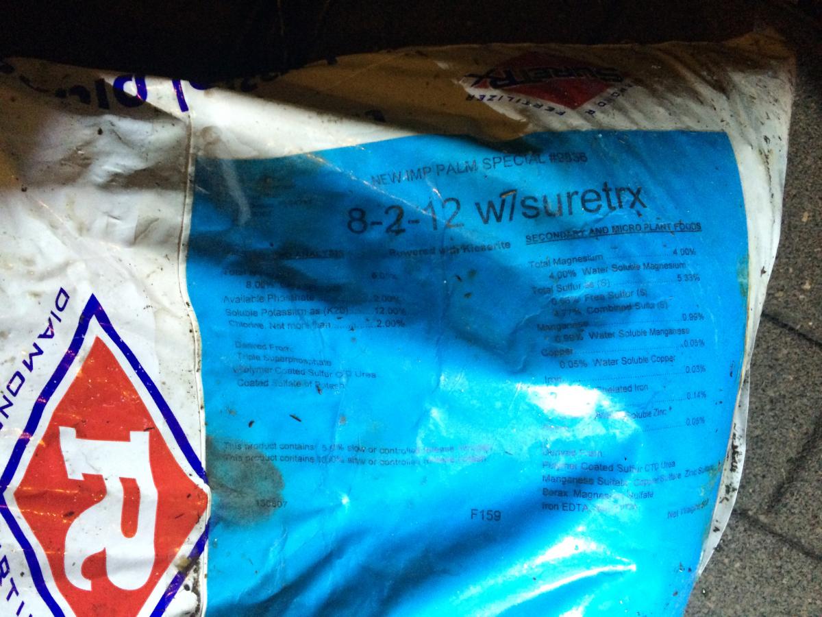 Last question, and every single person I have asked at the garden shops down here have answered with the same response "a couple of scoops". It's so bad that I don't even ask it anymore: How much fertilizer should I put down for each palm? They all have about 4 to 5 ft of trunk, maybe 7-9 inches in diameter at the thickest part. How much Manganese should each one get as well? I applied a 20lb bag of manganese evenly amongst the 9 trees about 5 months ago. I have been using fertilzer called Palm Special (8-2-12)