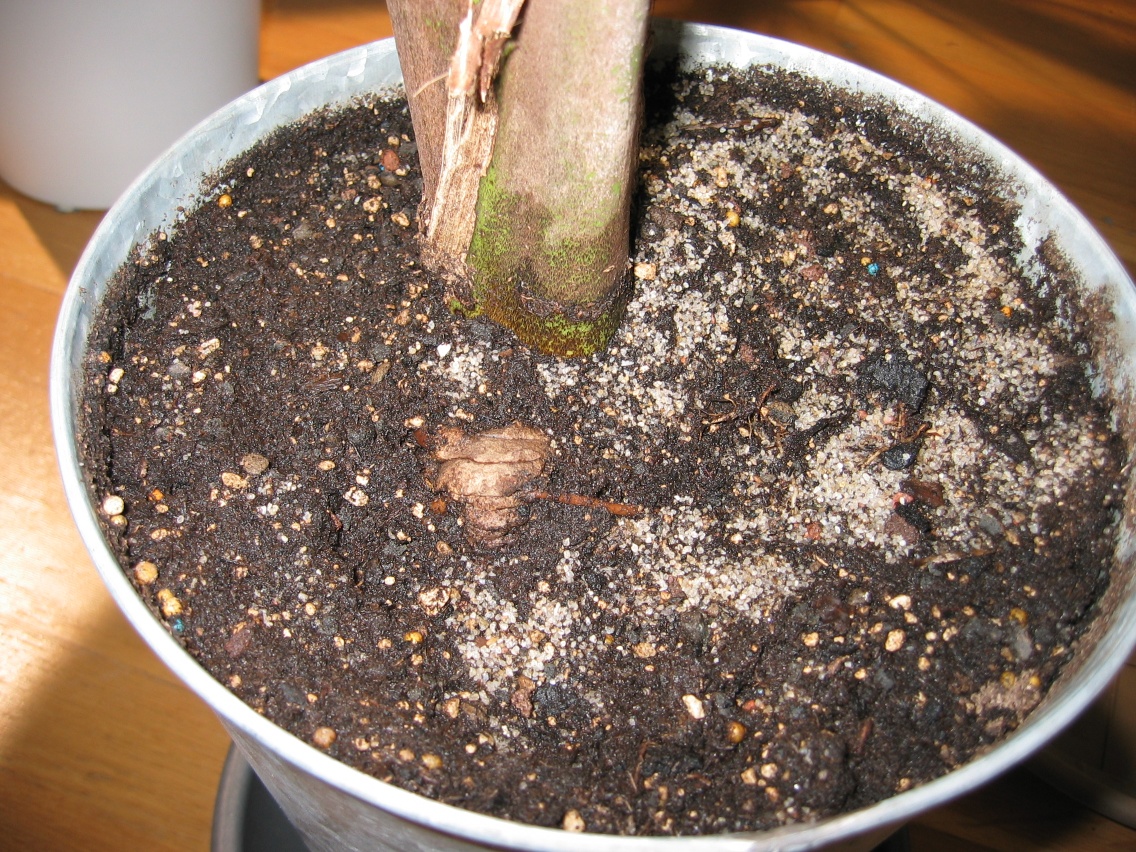 The first image shows the crevice, the 2nd the pale frond, the 3rd the whole palm (and the 4th is just a picture of the "saxophone style root" which shoots out roots even from its top now).
