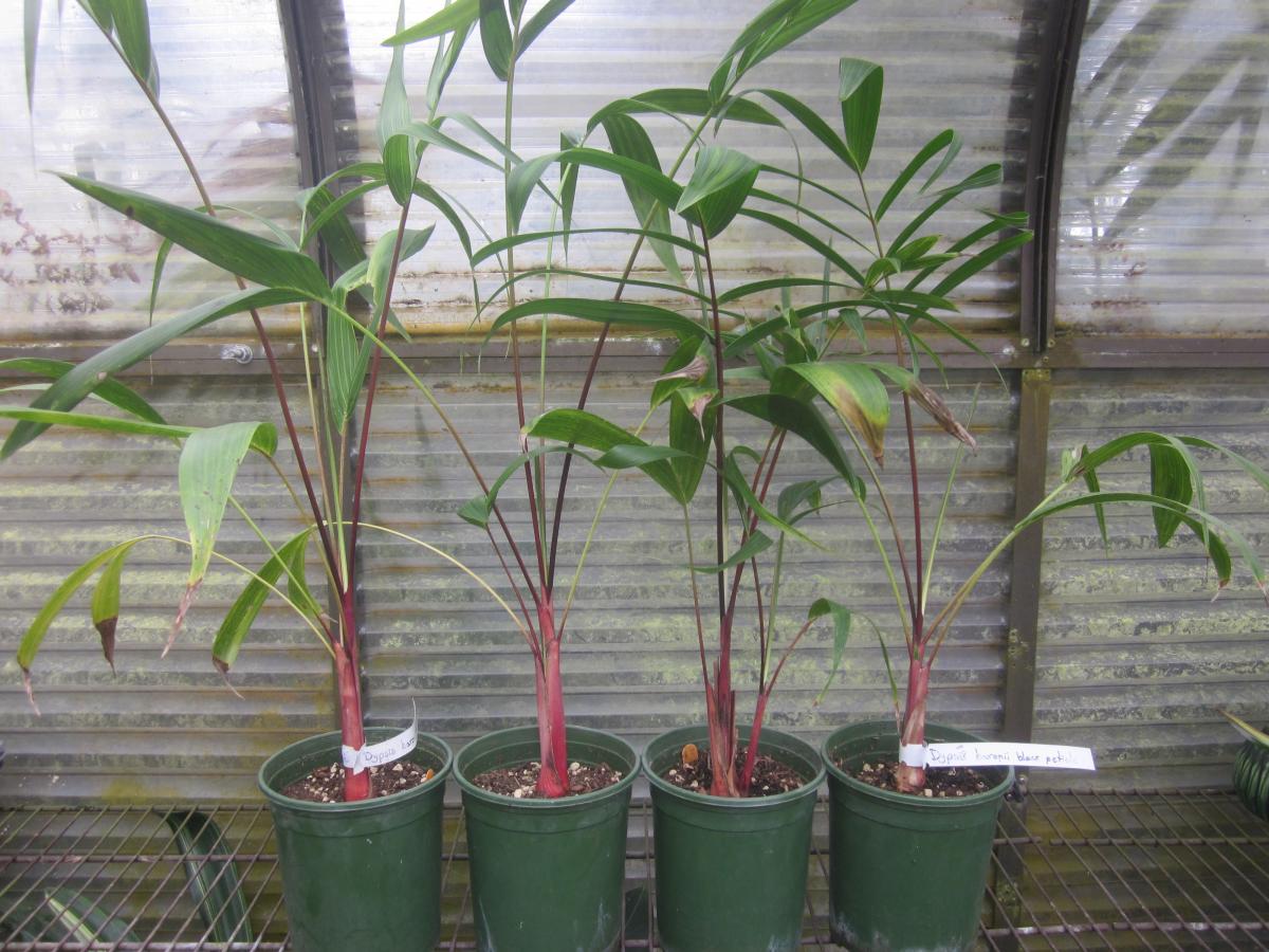 Dypsis sp. 'Black Stem' is one of the most colorful Dypsis seedlings I have grown. The white new emerging spears (like found in Albofarinosa) really contrast with the dark colors of the rest of the plant. This is a greenhouse grown palm right now. I hope the color is stable when planted outside in a few years.