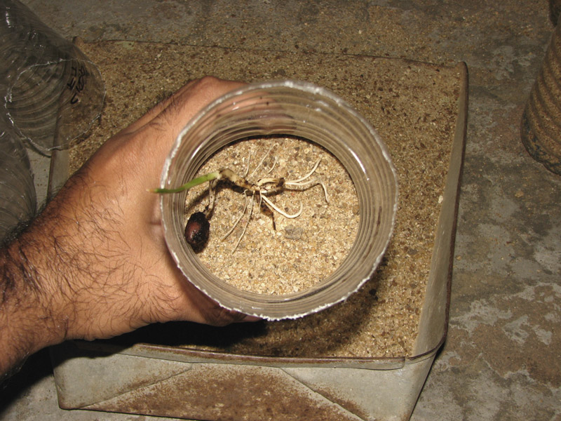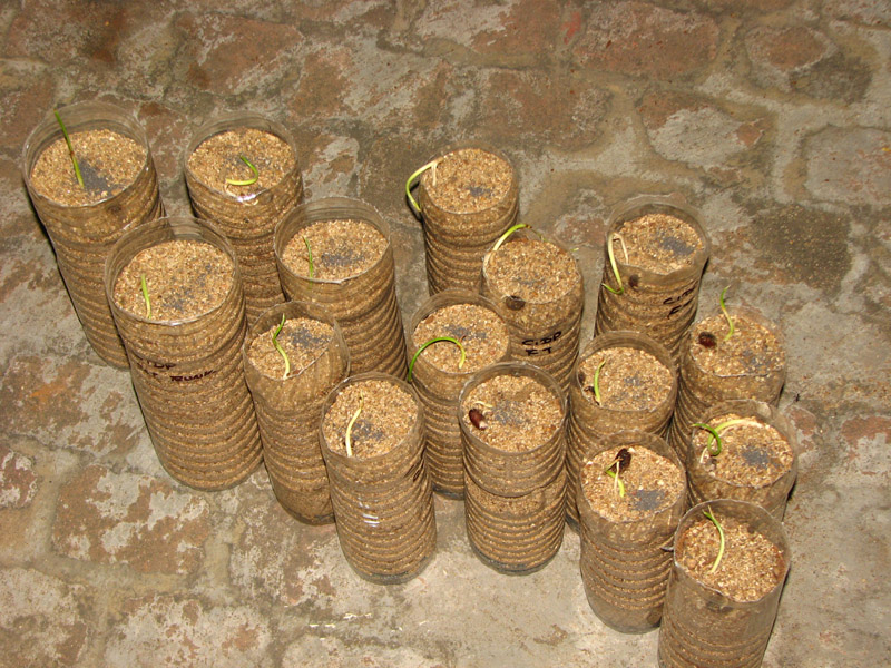 After seperating each of those young onces they are placed in mineral water bottles in my case,and before pouring the loose soil medium check for the saplings height..since some palms like to have their seed or its white primary shaft from where the green leaf sprout occurs not submerged in soil or dampness !  ???