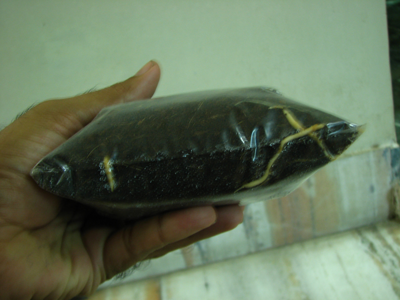NOTE: It's IMPORTANT to pre-soak the mix in another container and squeeze any excessive water out. You should be able to squeeze 1 or two drops of water out of a fistful of soil, any more than that and you will have rot/fungal issues. Its also important not to keep the baggie in stong daylight doing so may lead to aglal problems.